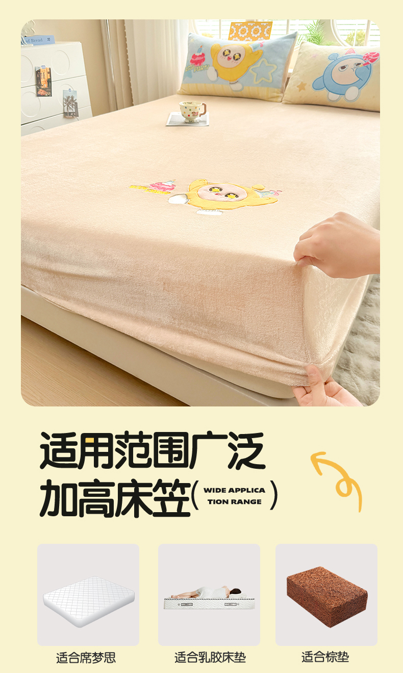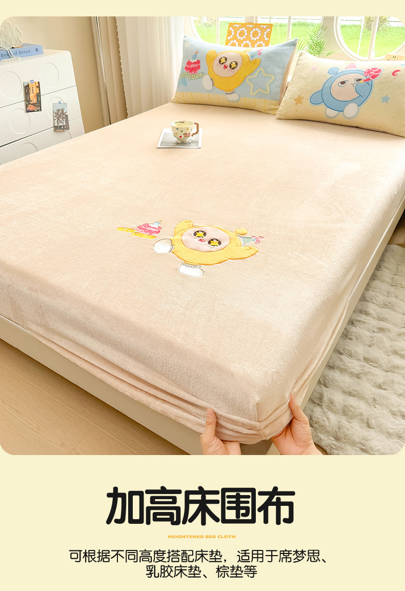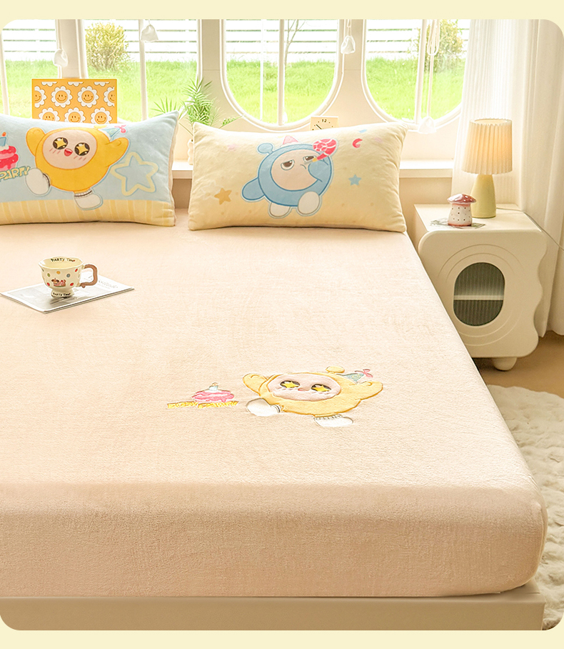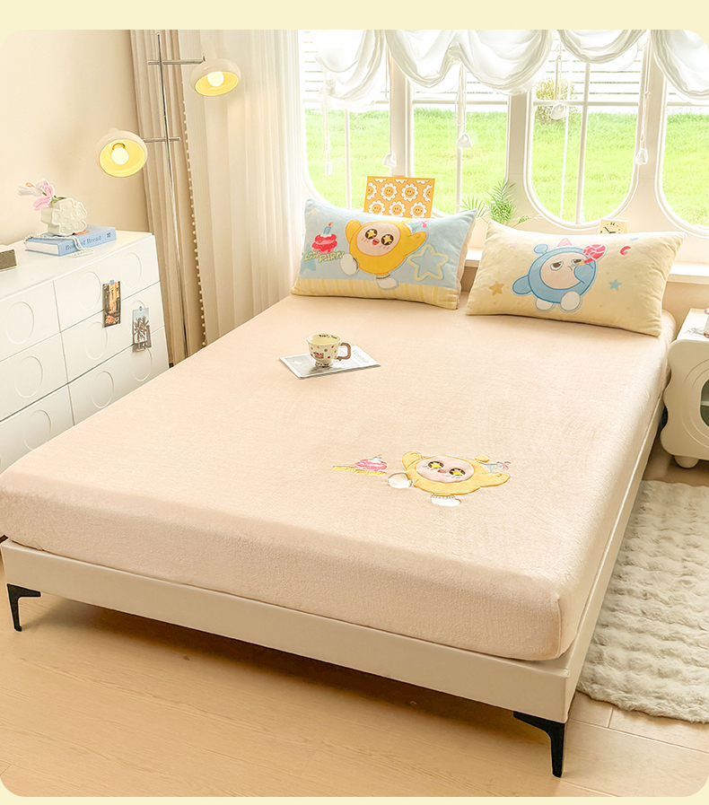 雯豆家纺 正版授权IP纯色贴布绣牛奶绒床笠三件套加厚卡通床垫保护套 黄蛋仔-米