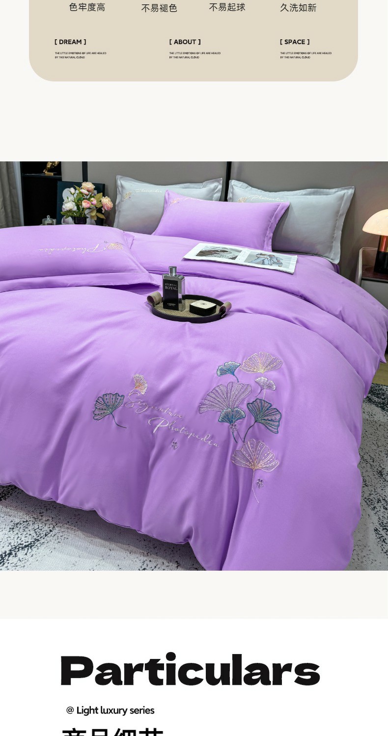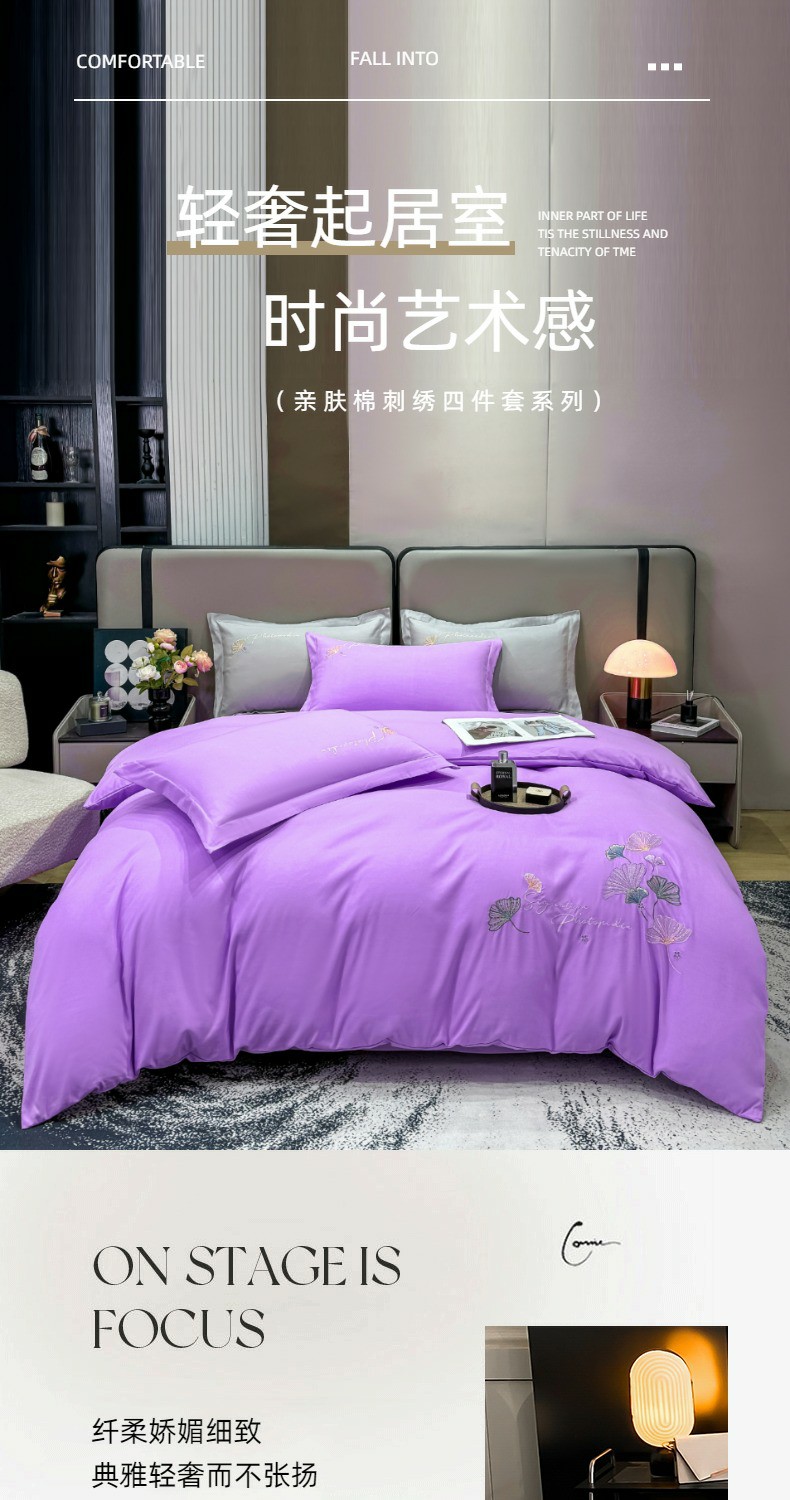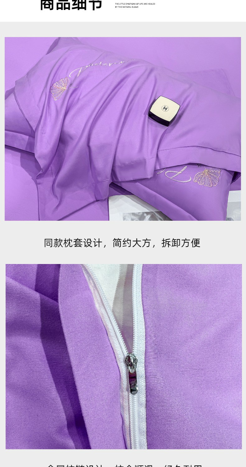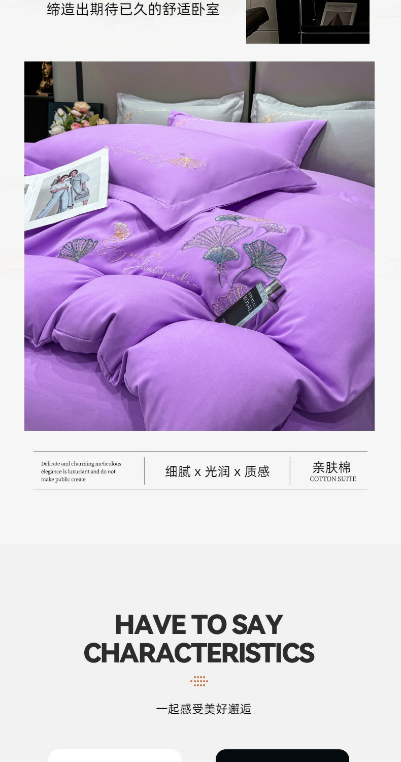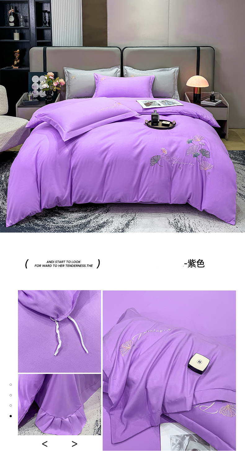 商品名称:悦织湾家纺 90克磨毛刺绣纯色四件套2025新款轻奢韩版公主风精致床上用品绣花亲肤水洗棉4件套 新银杏-紫色