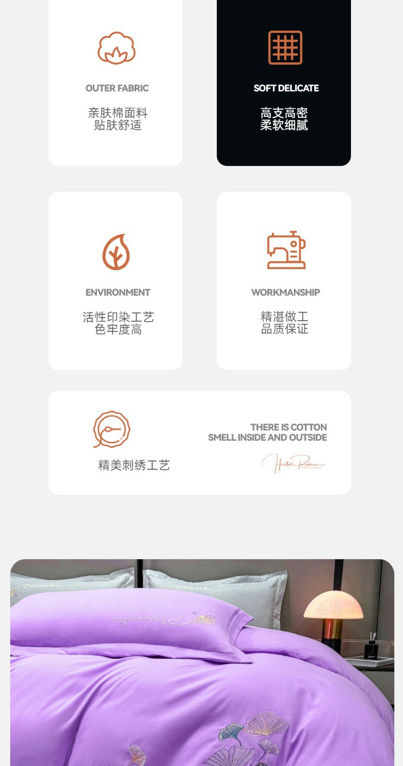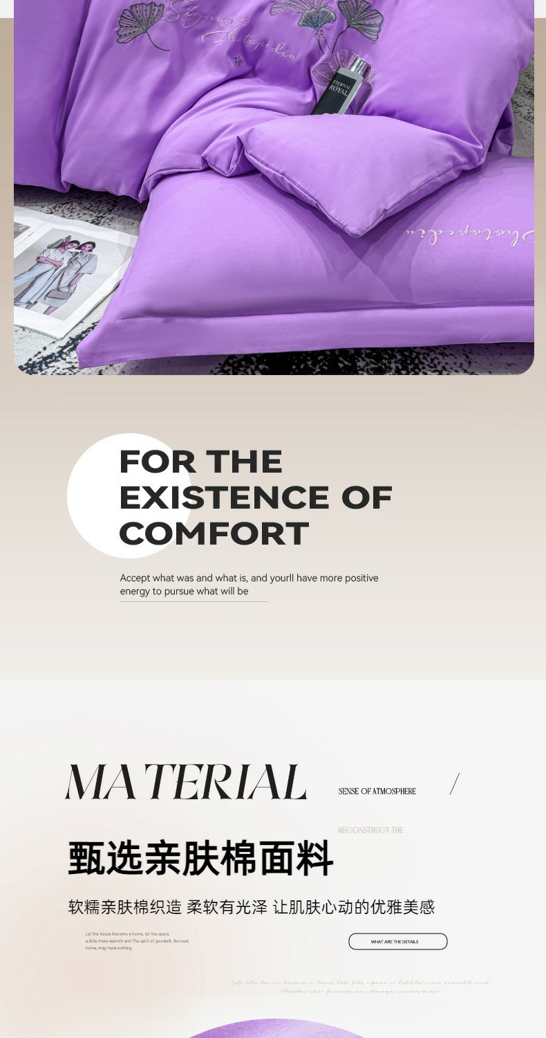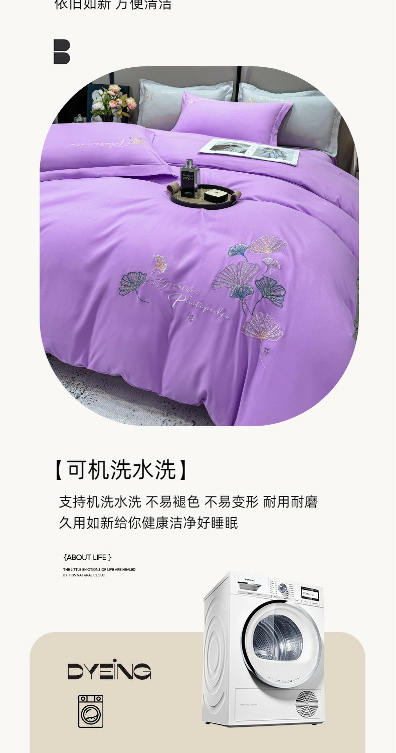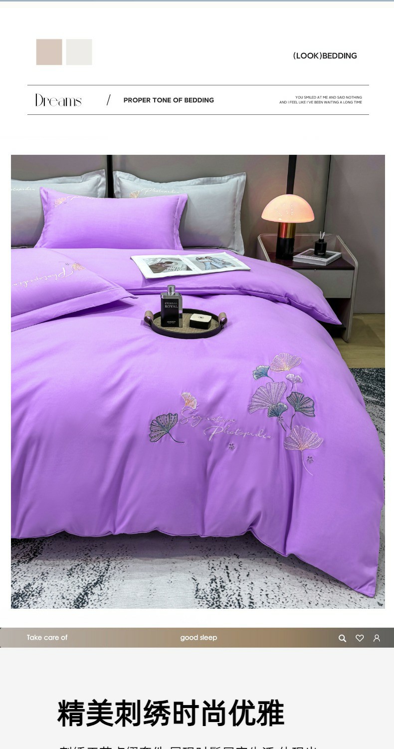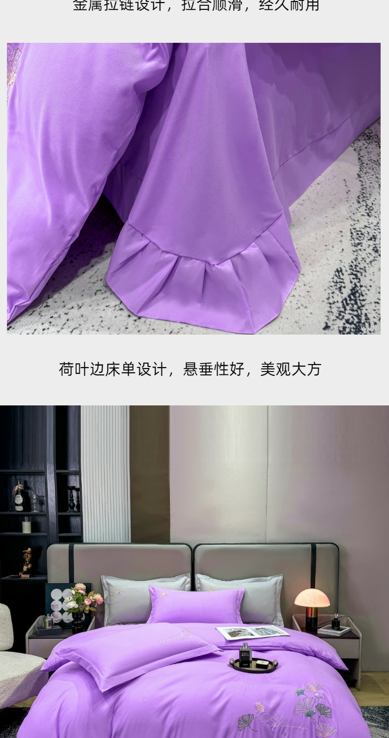 商品名称:悦织湾家纺 90克磨毛刺绣纯色四件套2025新款轻奢韩版公主风精致床上用品绣花亲肤水洗棉4件套 新银杏-紫色