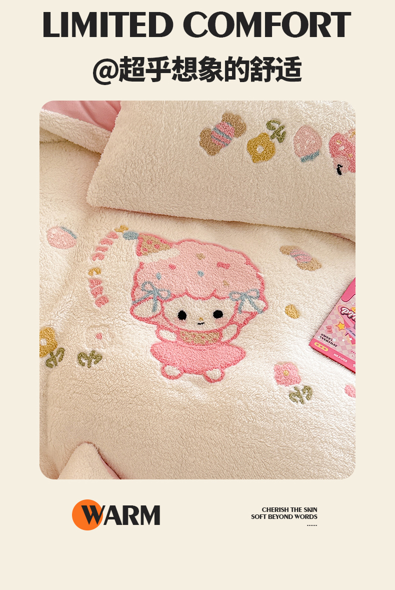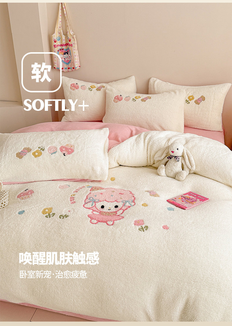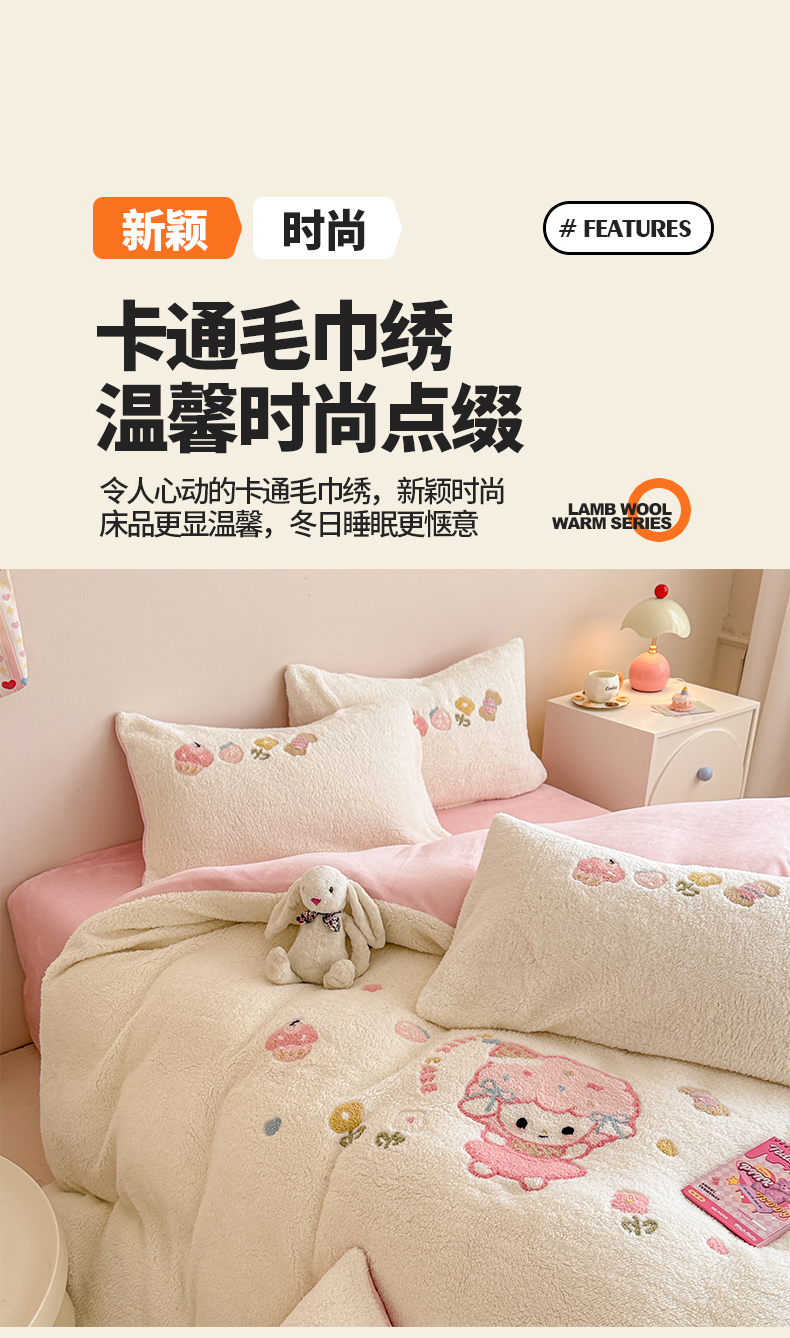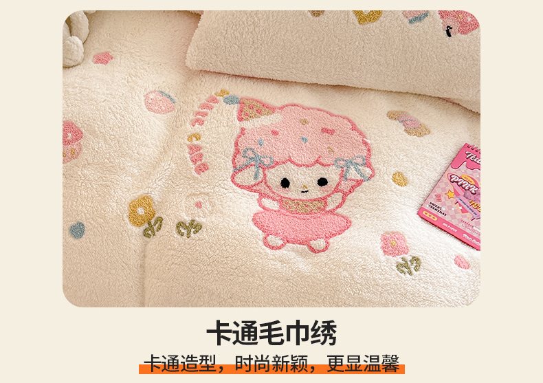当前位置: 91家纺网 > 商品网购 > 床品套件 > 四件套 > 其它四件套 > 典曼家纺 2025新款A类羊羔绒刺绣四件套系列 可爱童梦