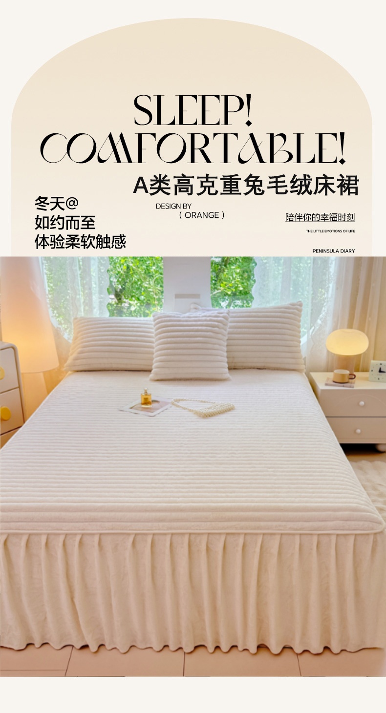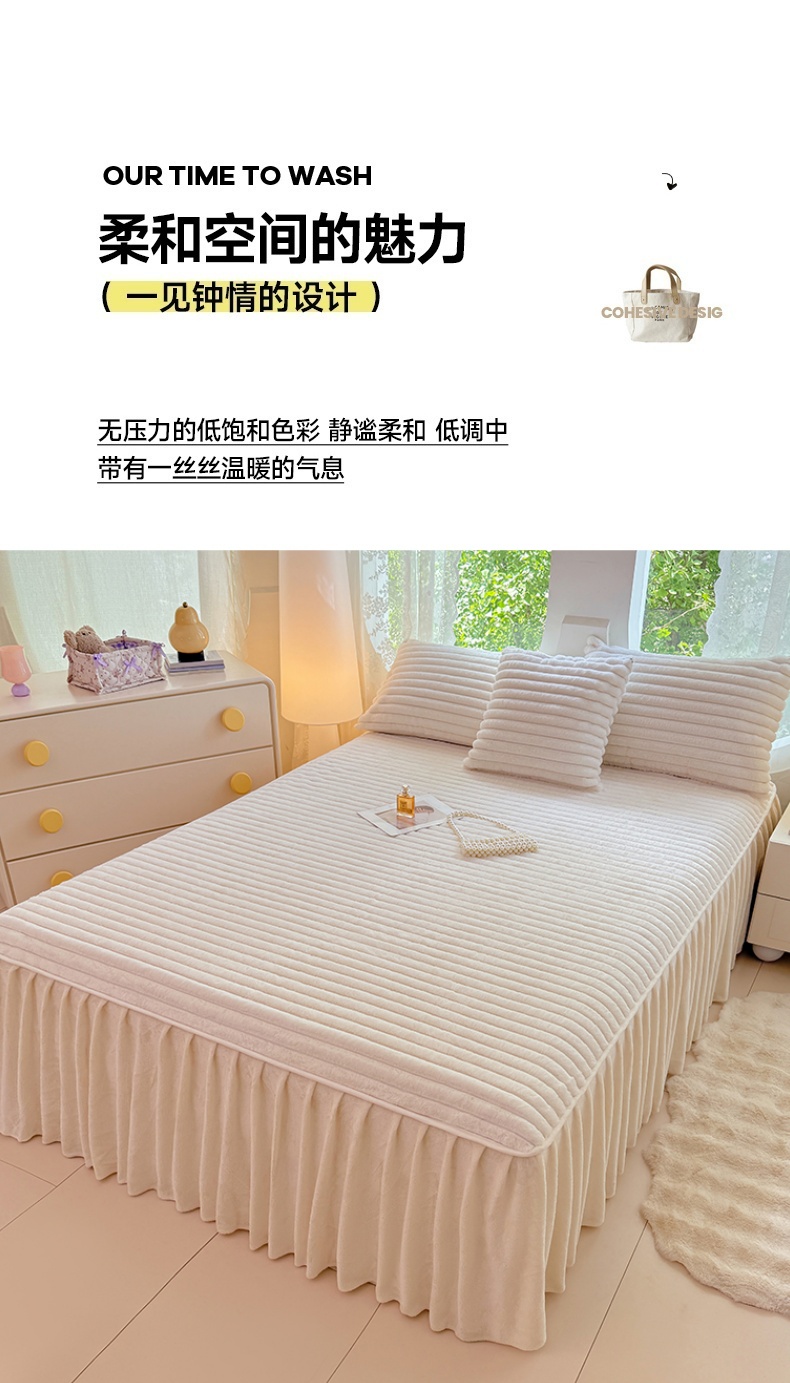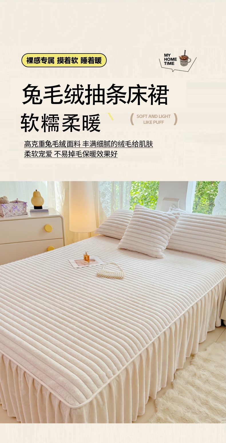 商品名称:梦舒羽 2025新款兔毛绒床裙法兰绒床垫保护罩牛奶绒床垫法莱绒床单罩-抽条 兔毛绒抽条-晨曦白