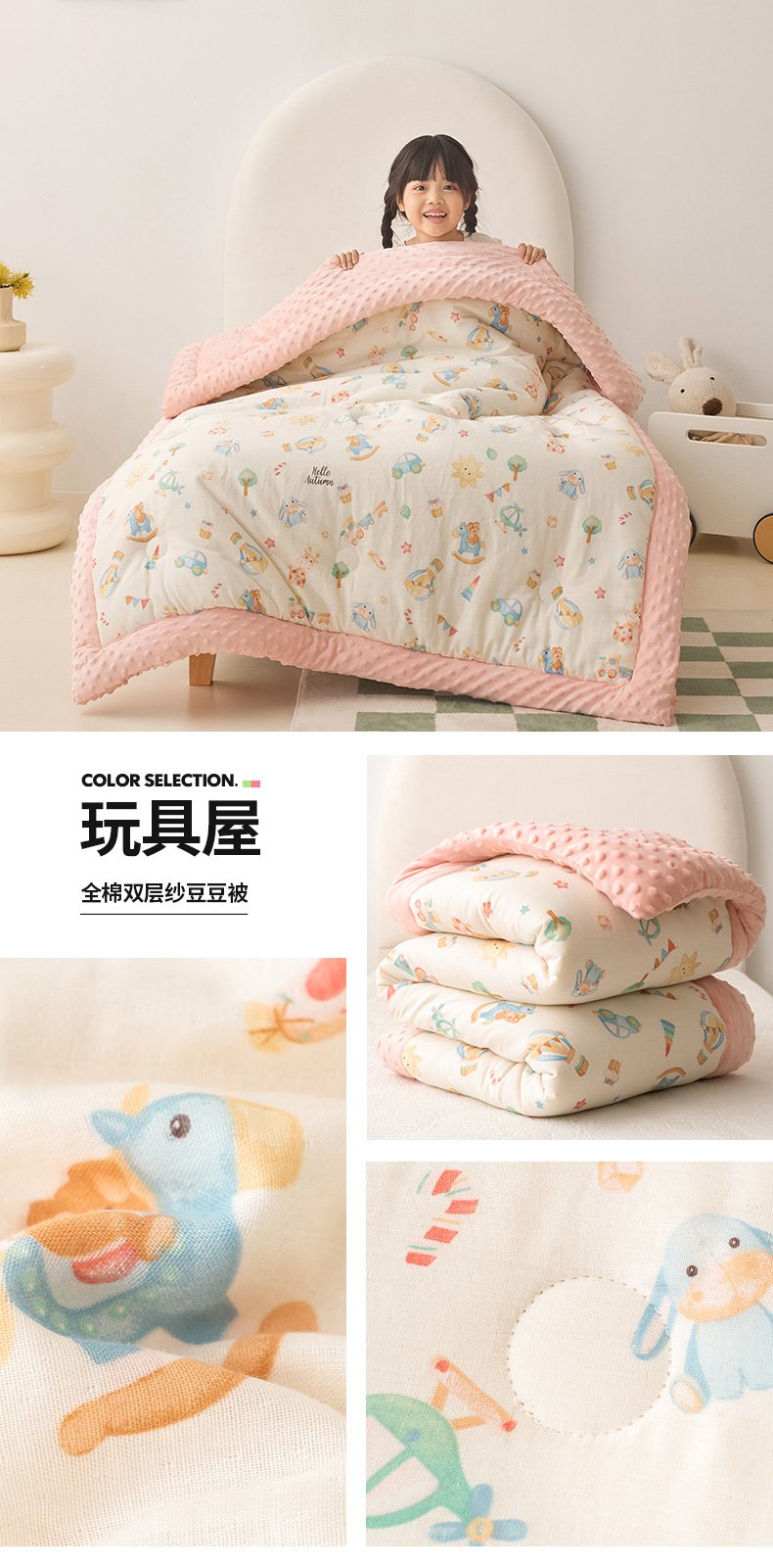 (总)嗨生活 2025新款全棉双层纱豆豆被 儿童被 春秋被 冬被 幼儿园被子,草莓兔兔,花丛小兔,米菲兔,汽车乐园,挖机恐龙,玩具屋,小海豚,熊猫盼盼