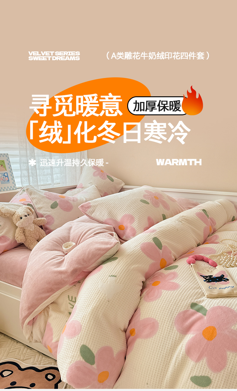 当前位置: 91家纺网 > 商品网购 > 床品套件 > 四件套 > 牛奶绒四件套 > 懒猫家纺 2025新款印花牛奶绒雕花四件套 恋恋花语
