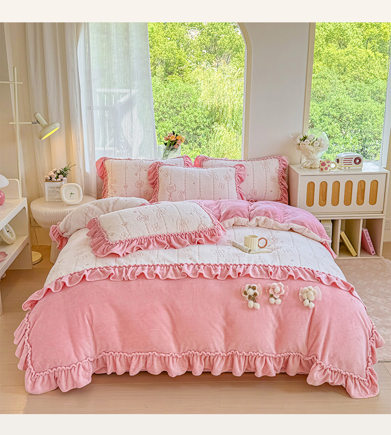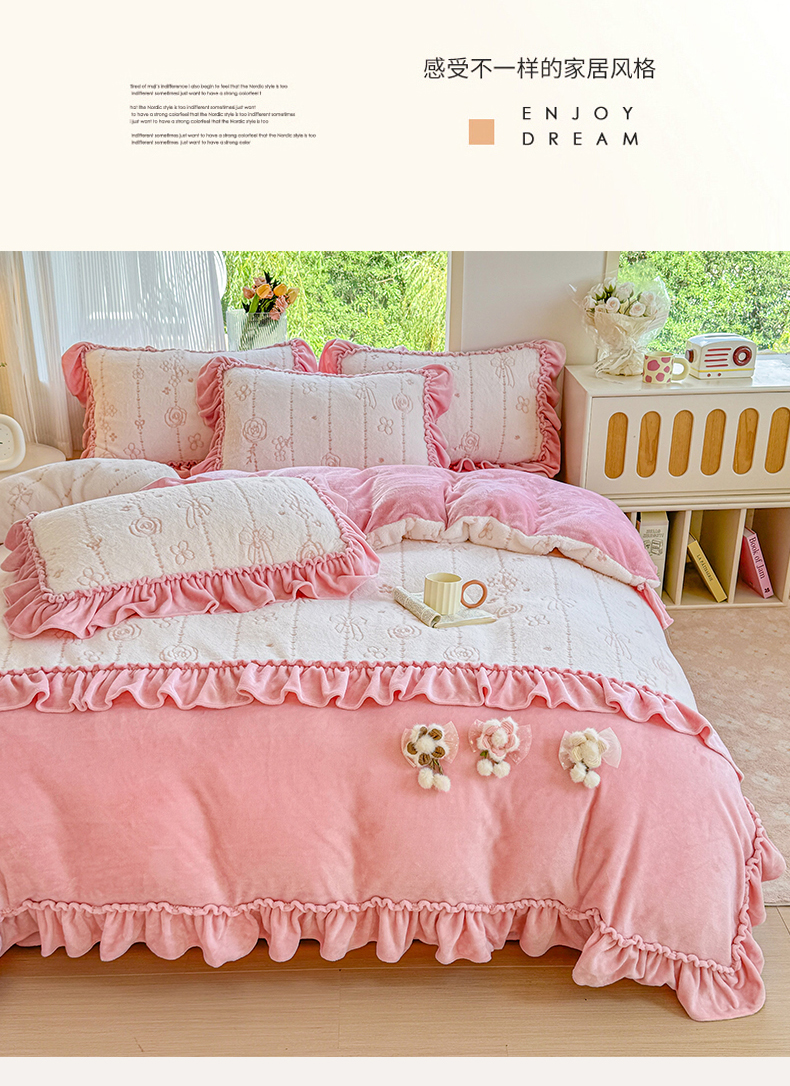 (总)【苏东来】2025高端加厚法式工艺款韩版盘花边纯色甜美公主赫本风拼接雕花兔毛绒牛奶绒四件套婴儿绒