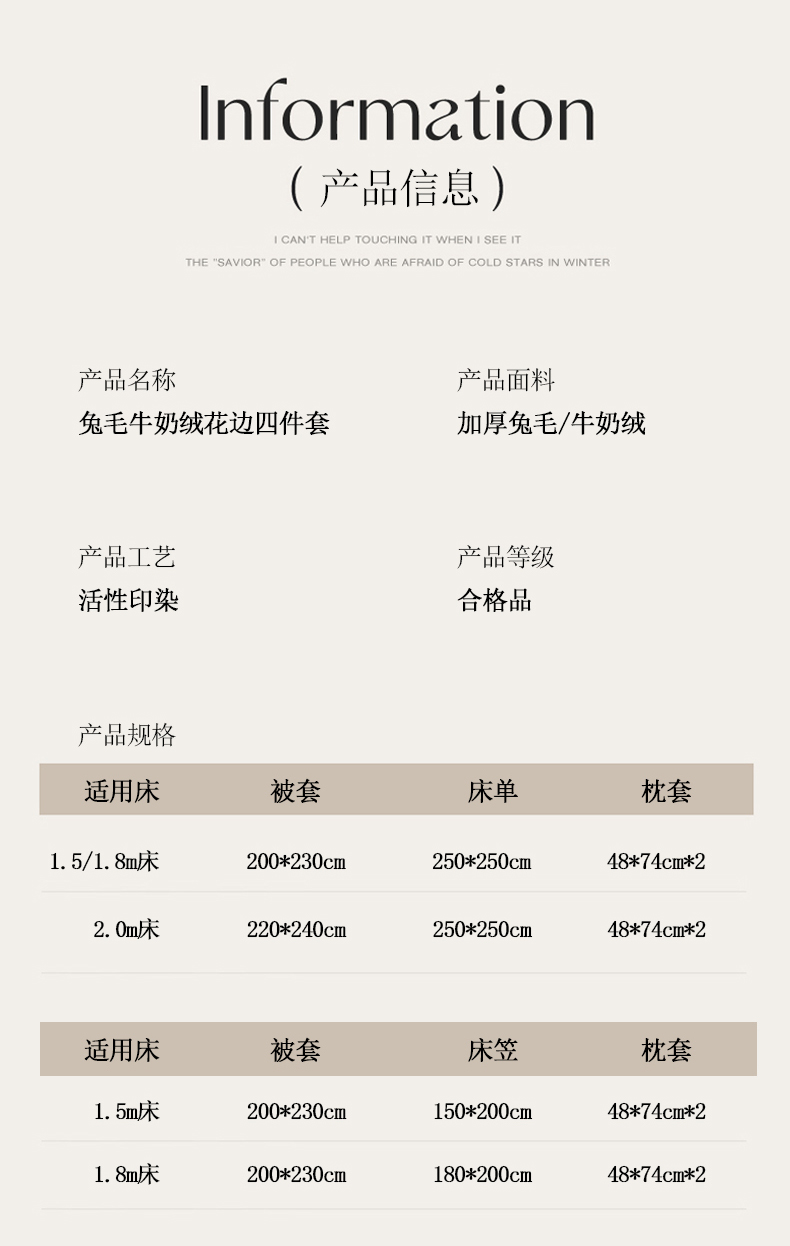 商品名称:(总)【苏东来】2025高端加厚法式工艺款韩版盘花边纯色甜美公主赫本风拼接雕花兔毛绒牛奶绒四件套婴儿绒