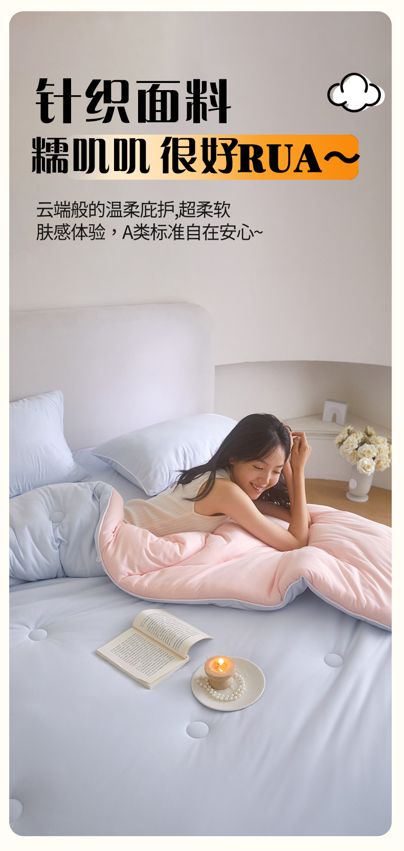 • 91家纺网 家纺一手货源 找家纺 头等舱 2025新款针织A类软糯净植力抗菌防螨防霉低致敏双拼秋冬被(模特图) 典雅蓝+粉玉