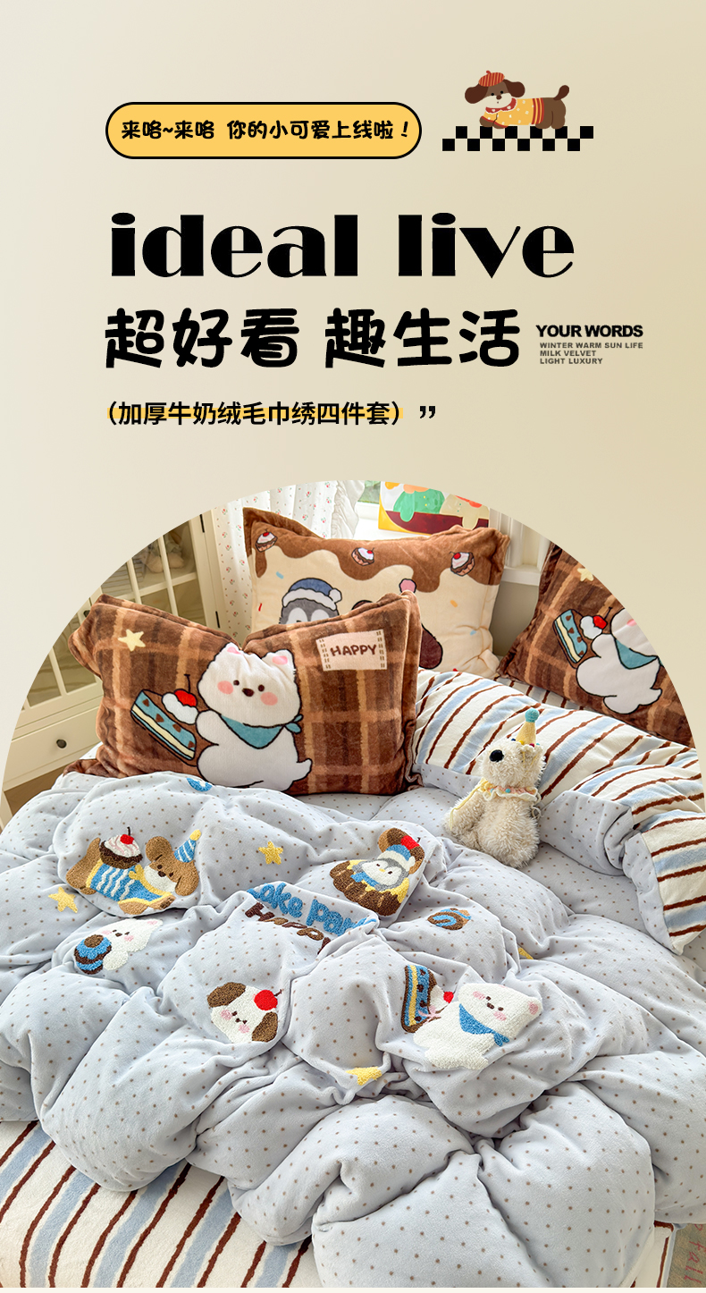 当前位置: 91家纺网 > 商品网购 > 床品套件 > 四件套 > 牛奶绒四件套 > 典曼家纺 2025新款200g牛奶绒数码印花加毛巾绣四件套 海盐蛋糕