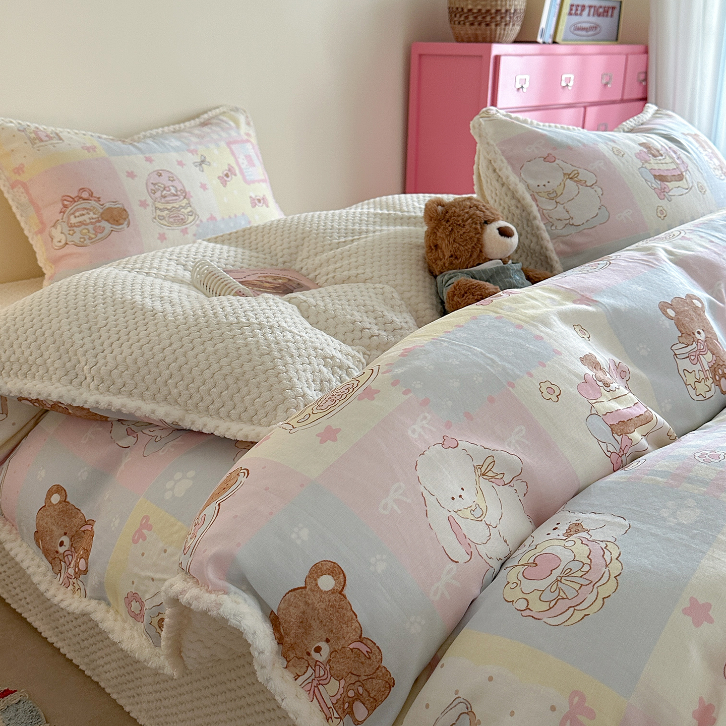 柚子YOUTH 2025新款全棉双层纱华夫格提花暖绒四件套 拼图爱丽丝