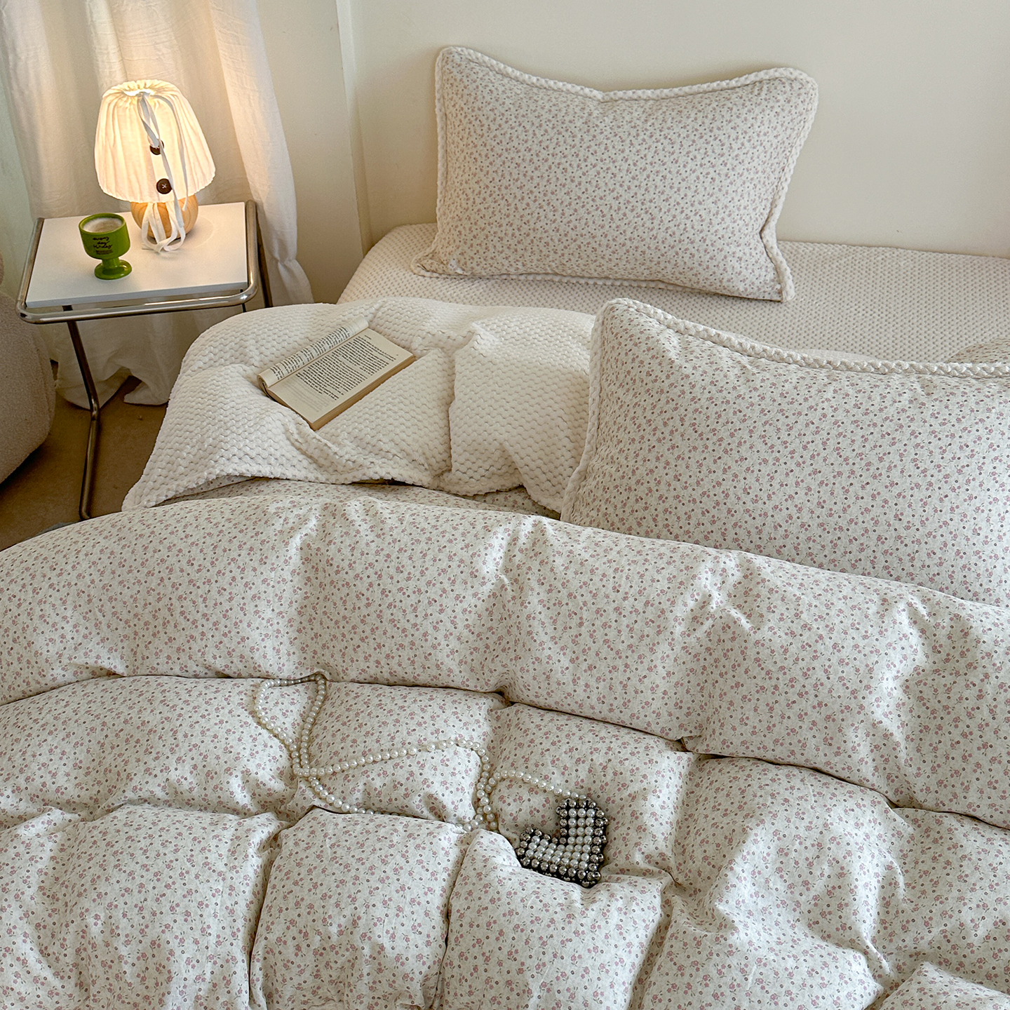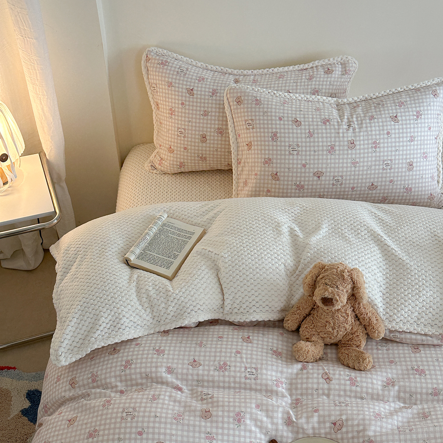 (总)柚子YOUTH 2025新款全棉双层纱华夫格提花暖绒四件套,馥郁花香,咖豹纹,兰格蜡笔画,玫瑰兔兔,拼图爱丽丝,ins咖格