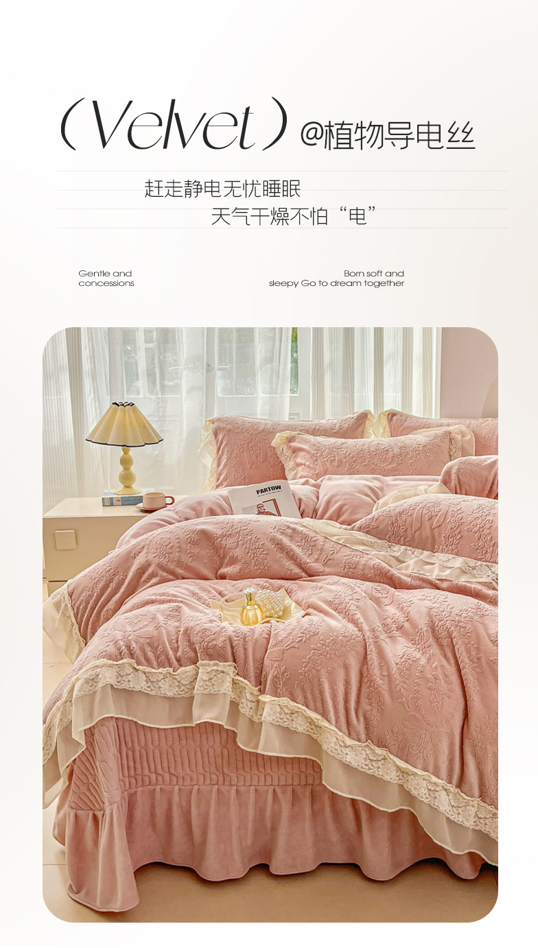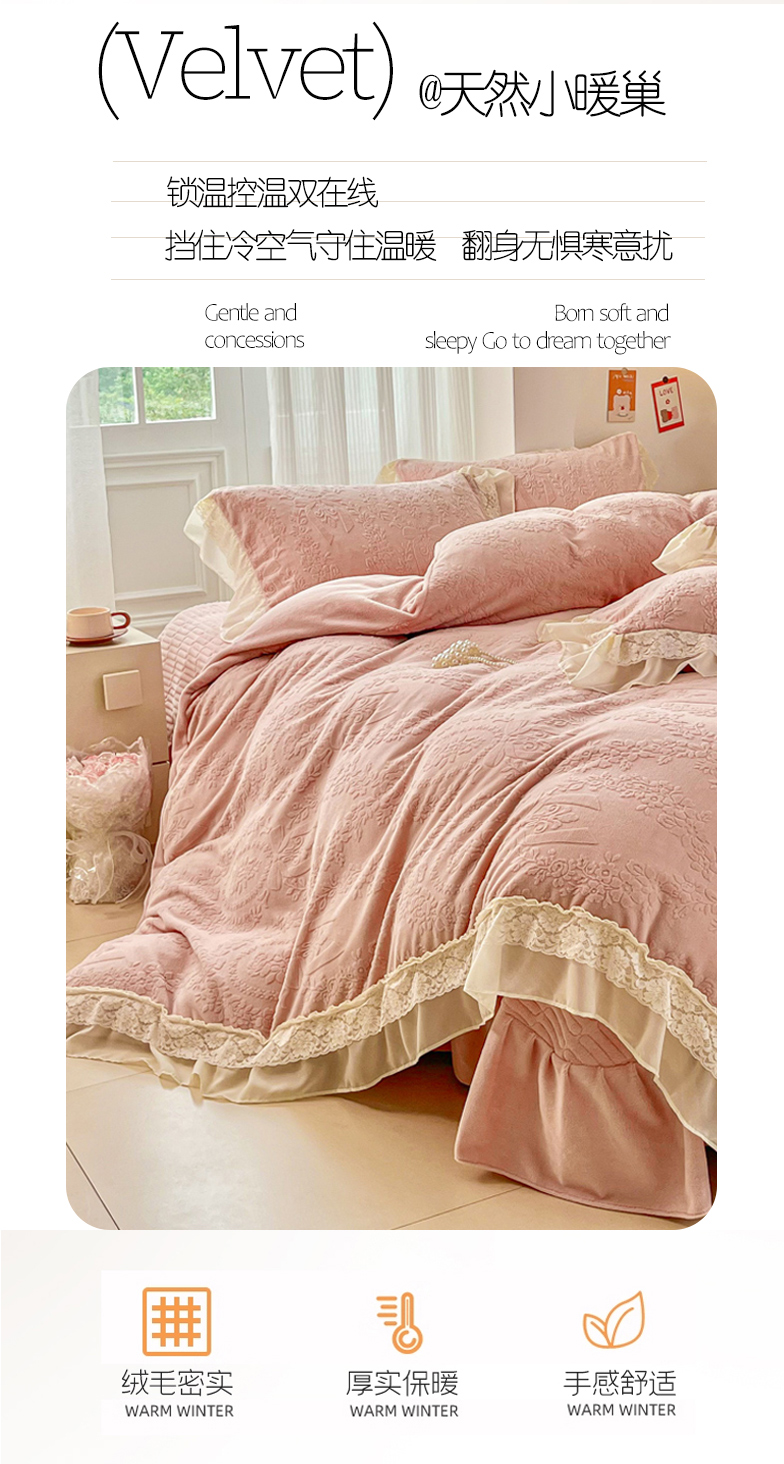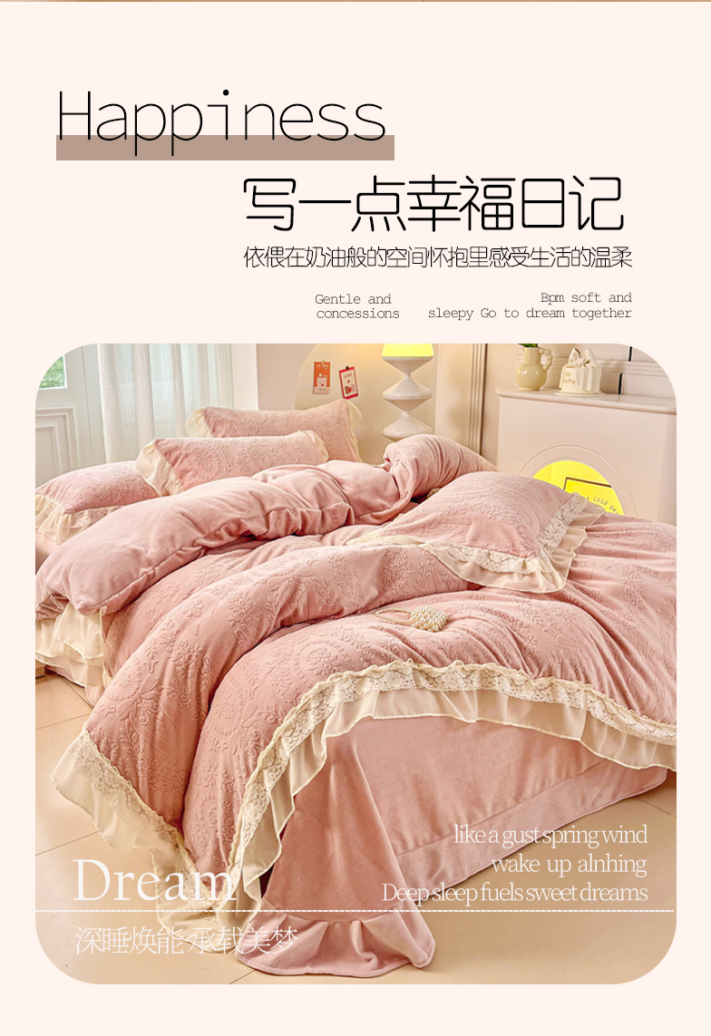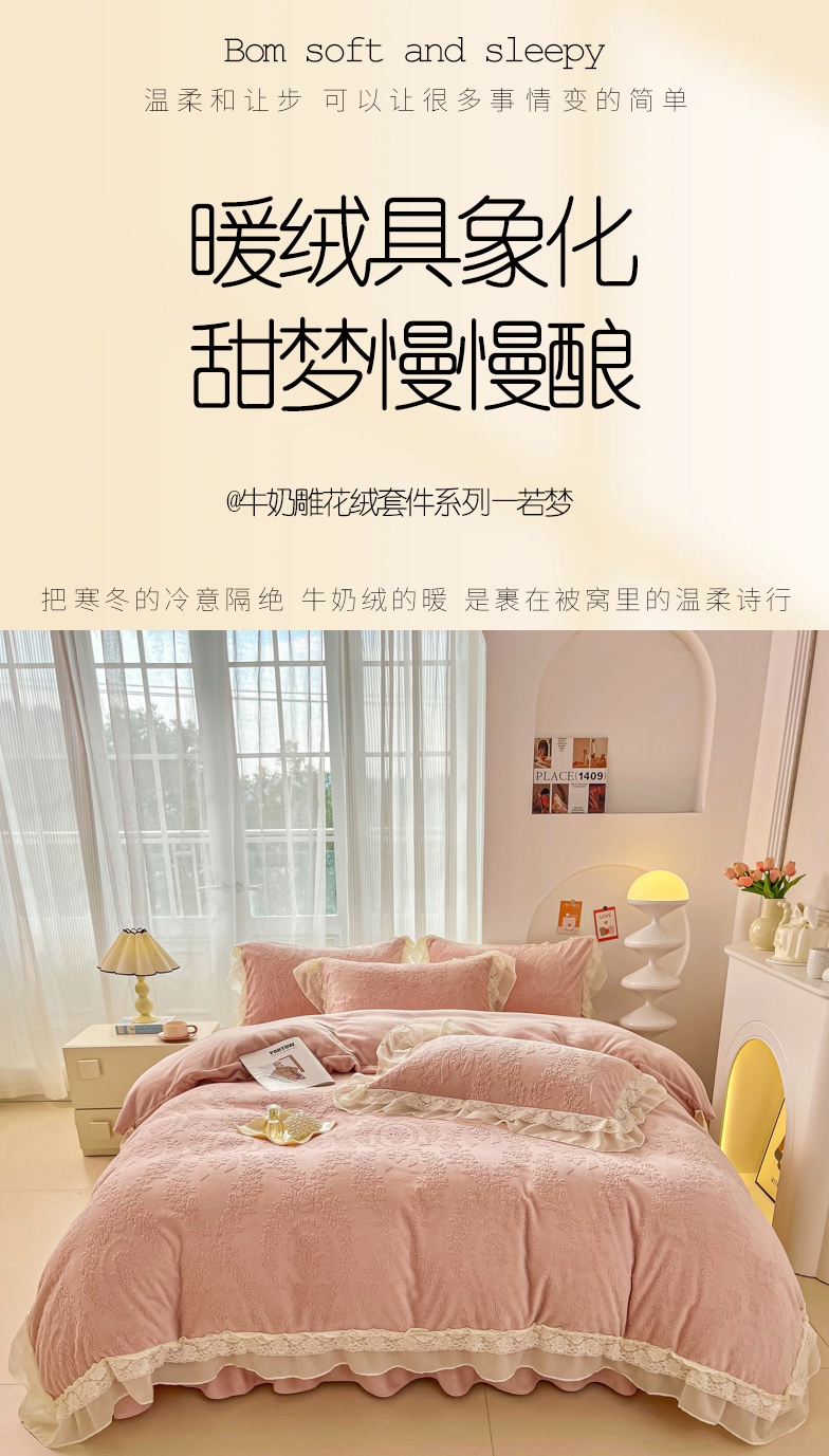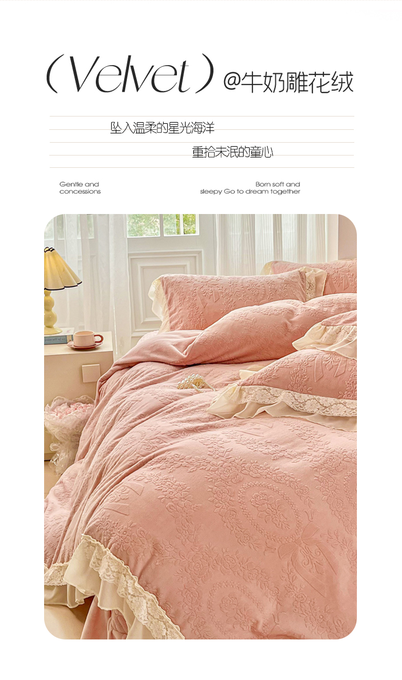 当前位置: 91家纺网 > 商品网购 > 床品套件 > 四件套 > 其它四件套 > 七七家纺 2025新款雕花牛奶绒夹棉床盖四件套-若梦系列 若梦-粉玉
