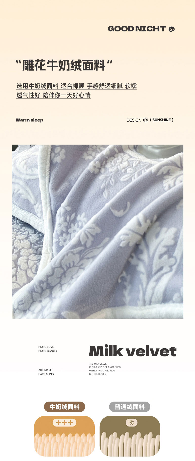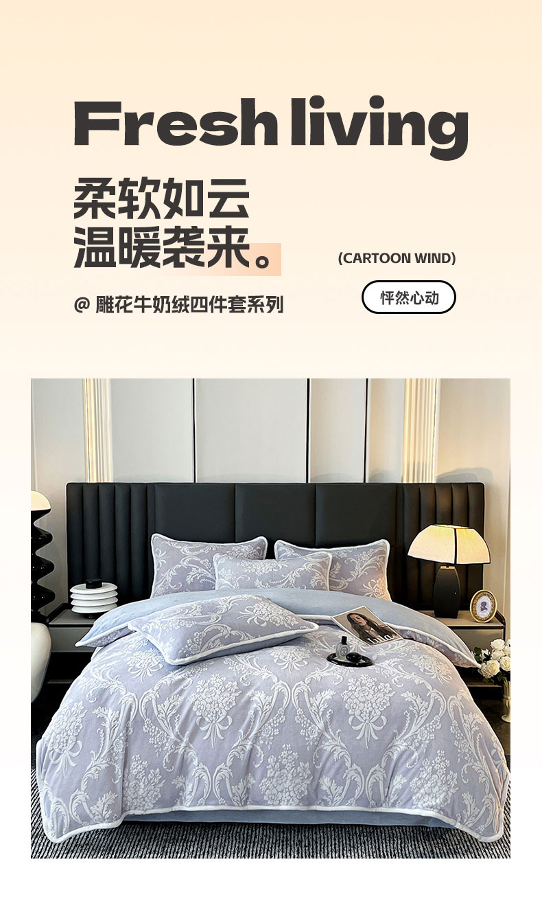(总)妮恒美家纺 2025新款雕花牛奶绒四件套,法式浪漫-嫣紫,法式浪漫-海蓝灰,法式浪漫-奶茶杏,山水画-海蓝灰,山水画-浅豆沙,山水画-嫣紫,雪莲花-草绿,雪莲花-暖心玉,雪莲花-浅灰绿