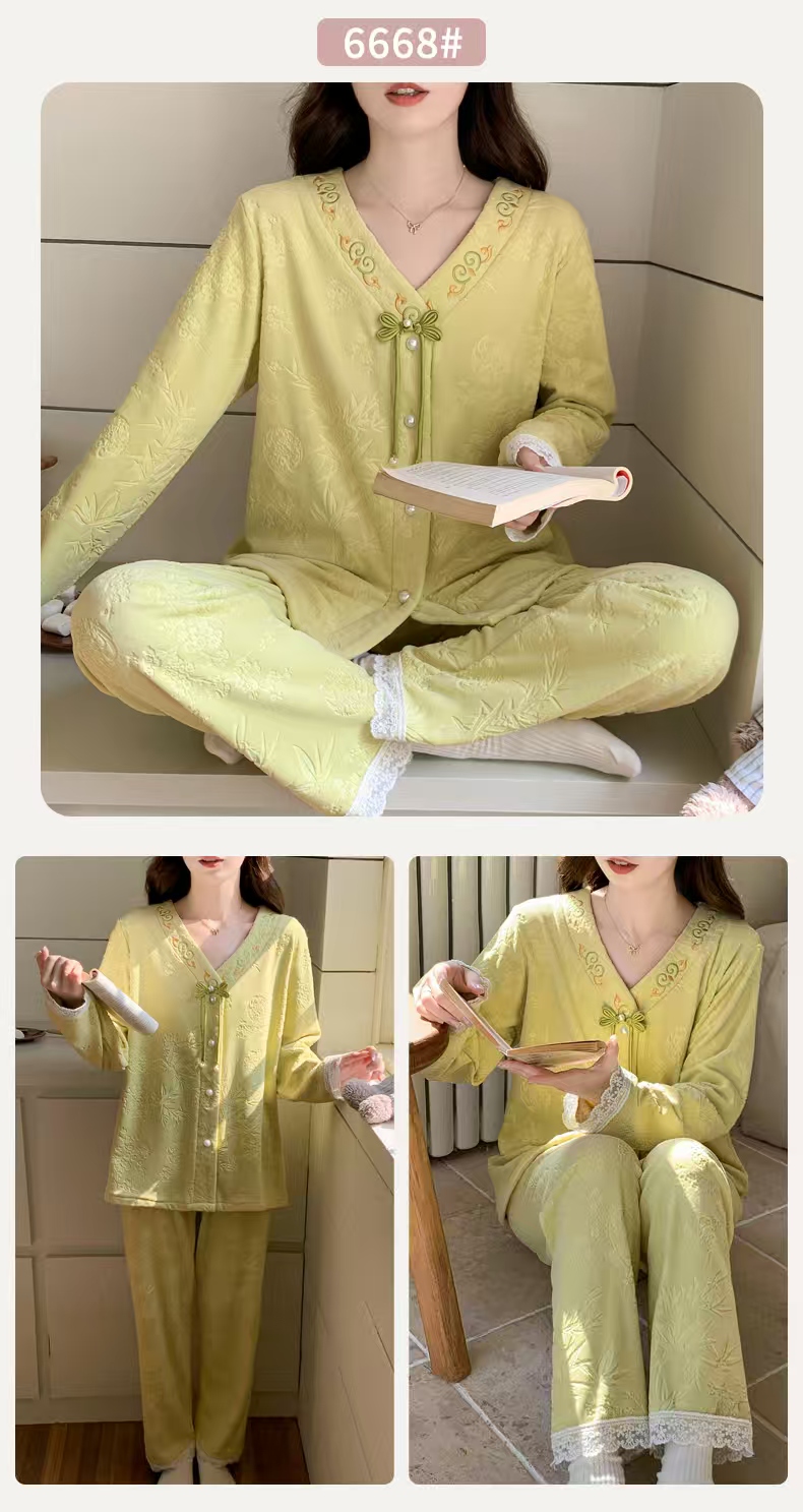 (总)洛兰沙家居馆 2024新款清新款睡衣女秋冬三层夹棉珊瑚绒加厚保暖两件套女士可外穿加绒家居服,99078,99077,99064,99065,99076,99063,99062