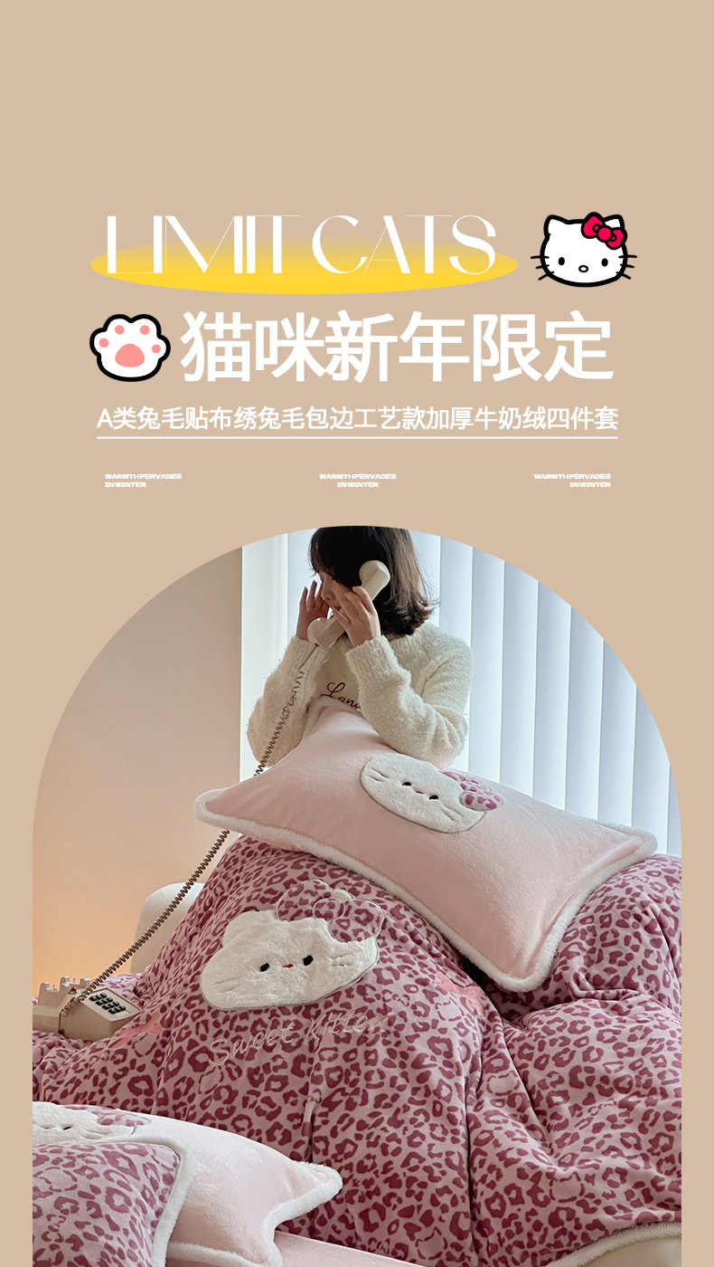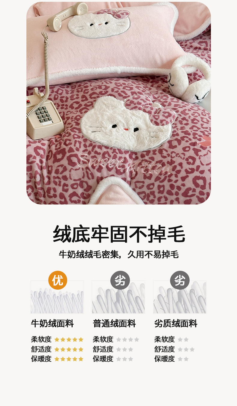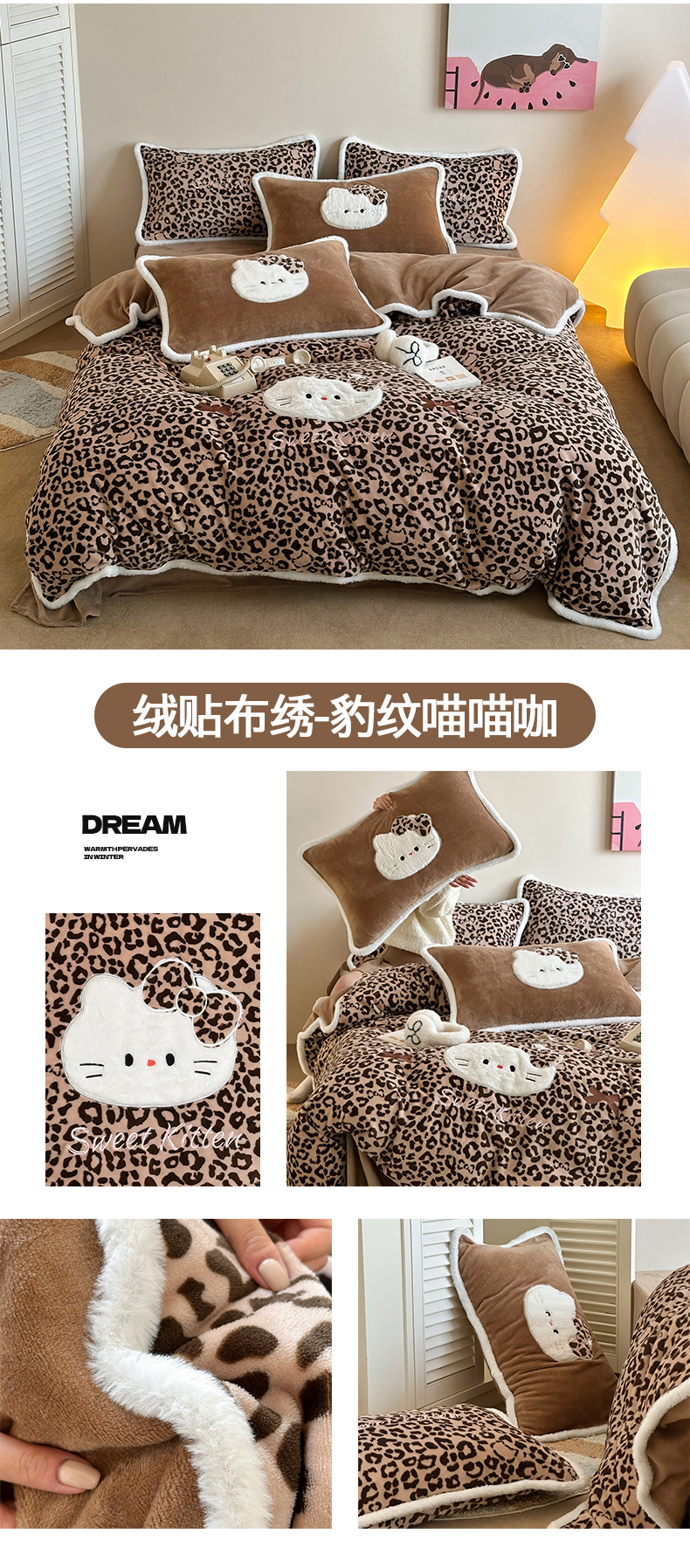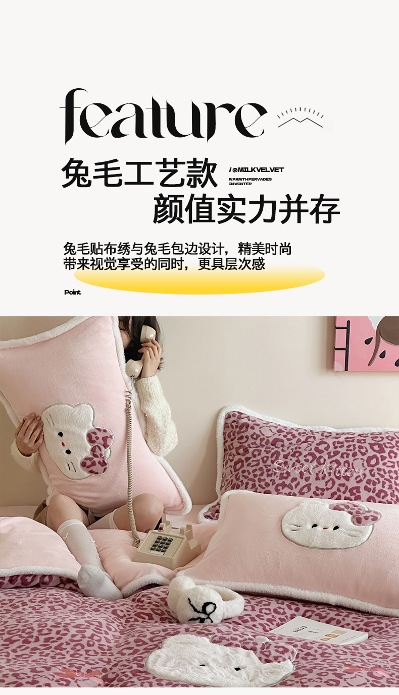 当前位置: 91家纺网 > 商品网购 > 床品套件 > 四件套 > 牛奶绒四件套 > 桃子家居 2026新款A类新年限定兔毛贴布绣猫咪可爱公主兔毛包边工艺款加厚牛奶绒四件套 绒贴布绣-豹纹喵喵粉