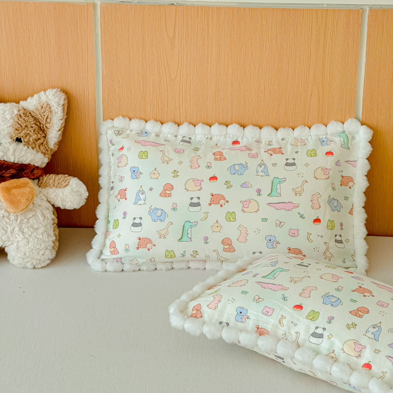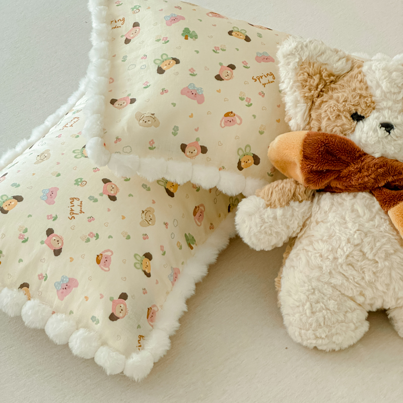 金丝鸟家纺 2026新款全棉双层纱毛球款枕套多规格儿童枕套 奇迹动物园 米