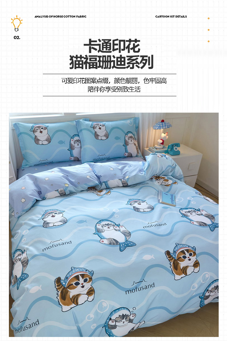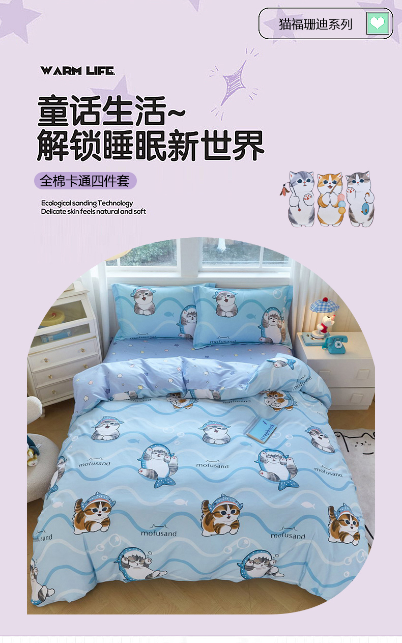 当前位置: 91家纺网 > 商品网购 > 床品套件 > 四件套 > 全棉普通四件套 > 蘭菲家纺 2026新款全棉大版鲨鱼猫套件-猫福系列四件套 珊迪出海-猫福系列