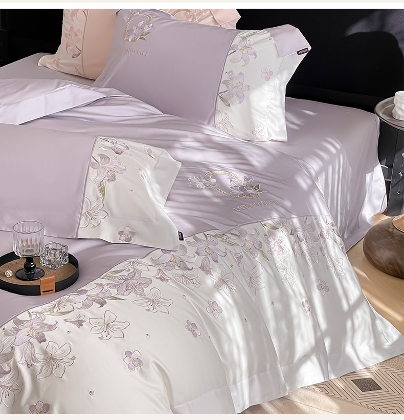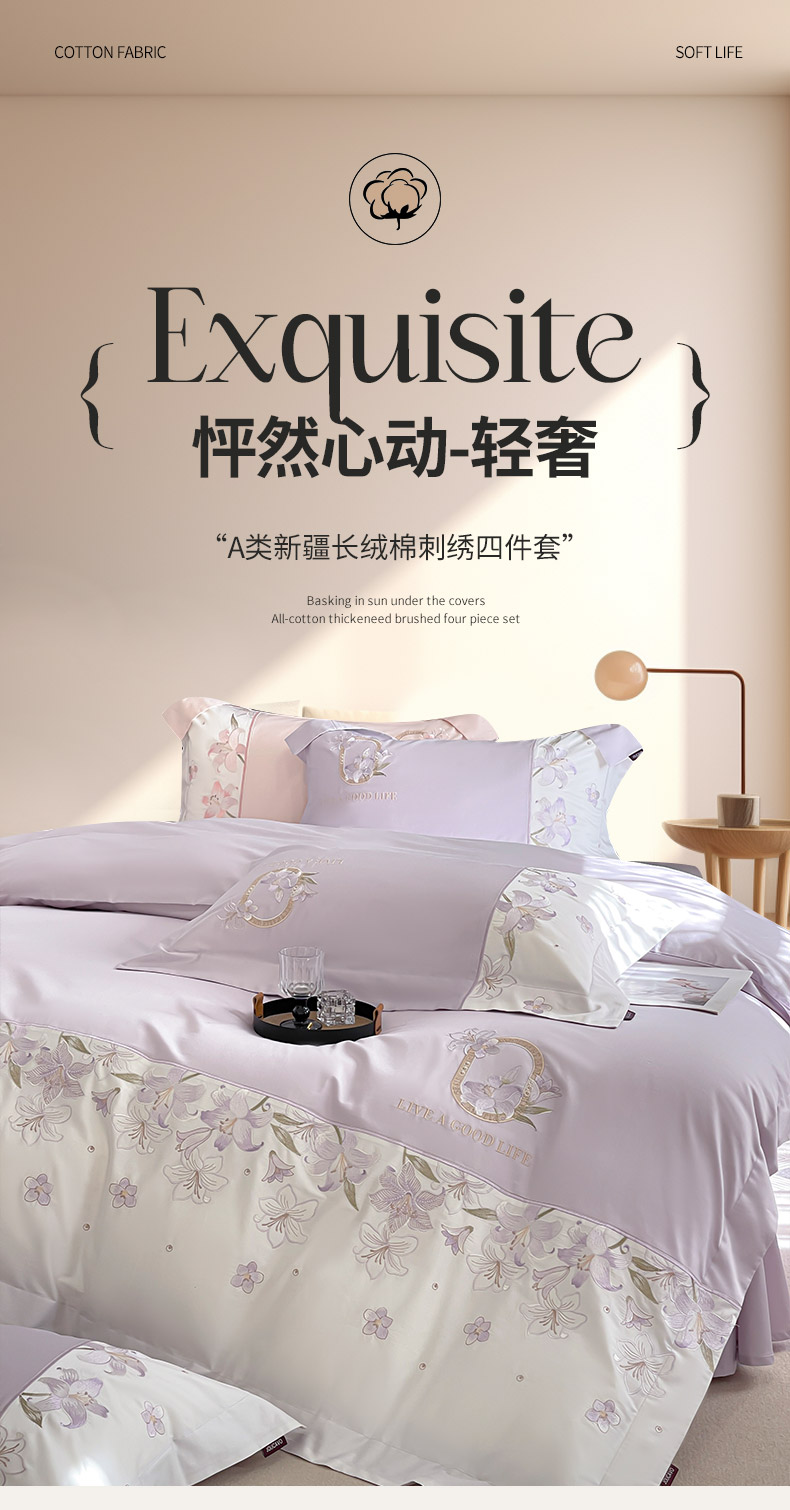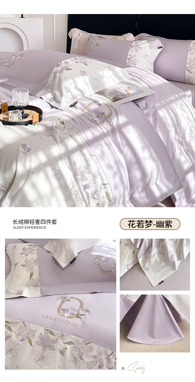 2026新款特供款A类长绒棉纯棉四件套100全棉少女心刺绣被套床单床笠床上用品 花若梦-幽紫