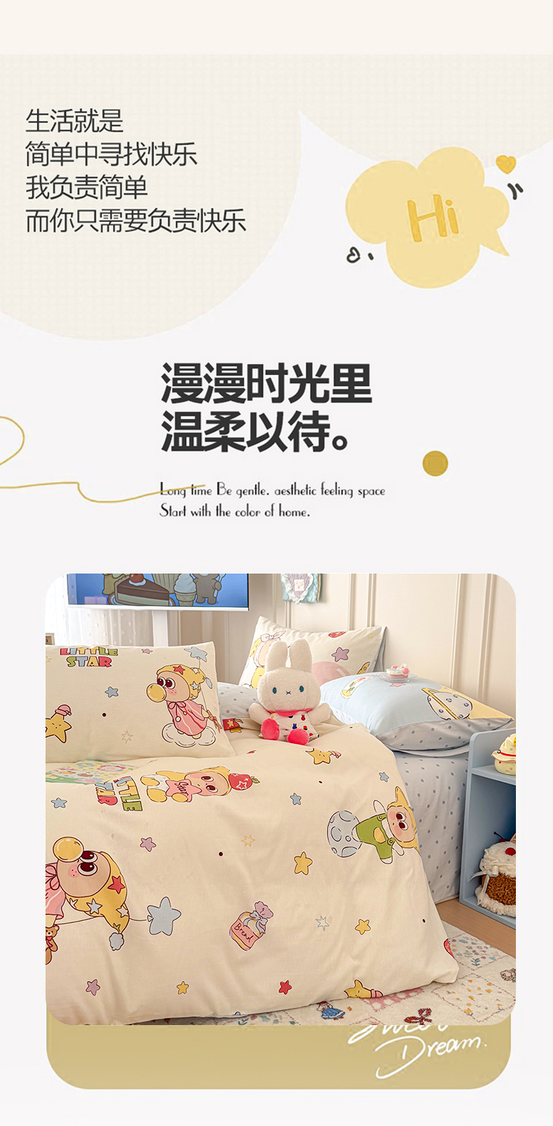 (总)呗旺鹿 2026新款全棉纯棉40支13070卡通印花四件套-场景二,萌星,鼻涕狗,果子象,机灵猫,可爱星人,幸福小熊