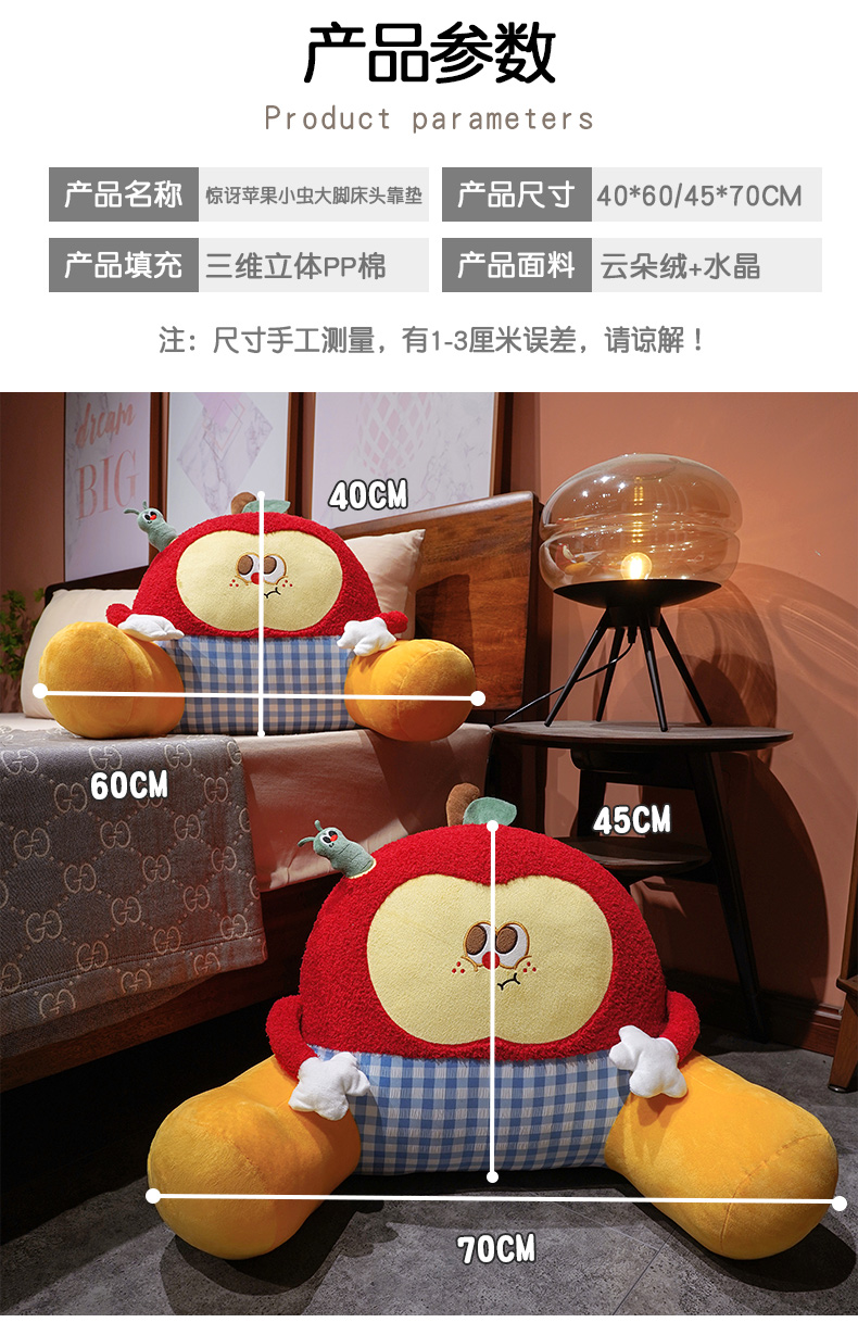当前位置: 91家纺网 > 商品网购 > 居家日用 > 靠垫/抱枕 > (总)仟亿莱 2026新款惊讶苹果小虫大脚床头靠垫