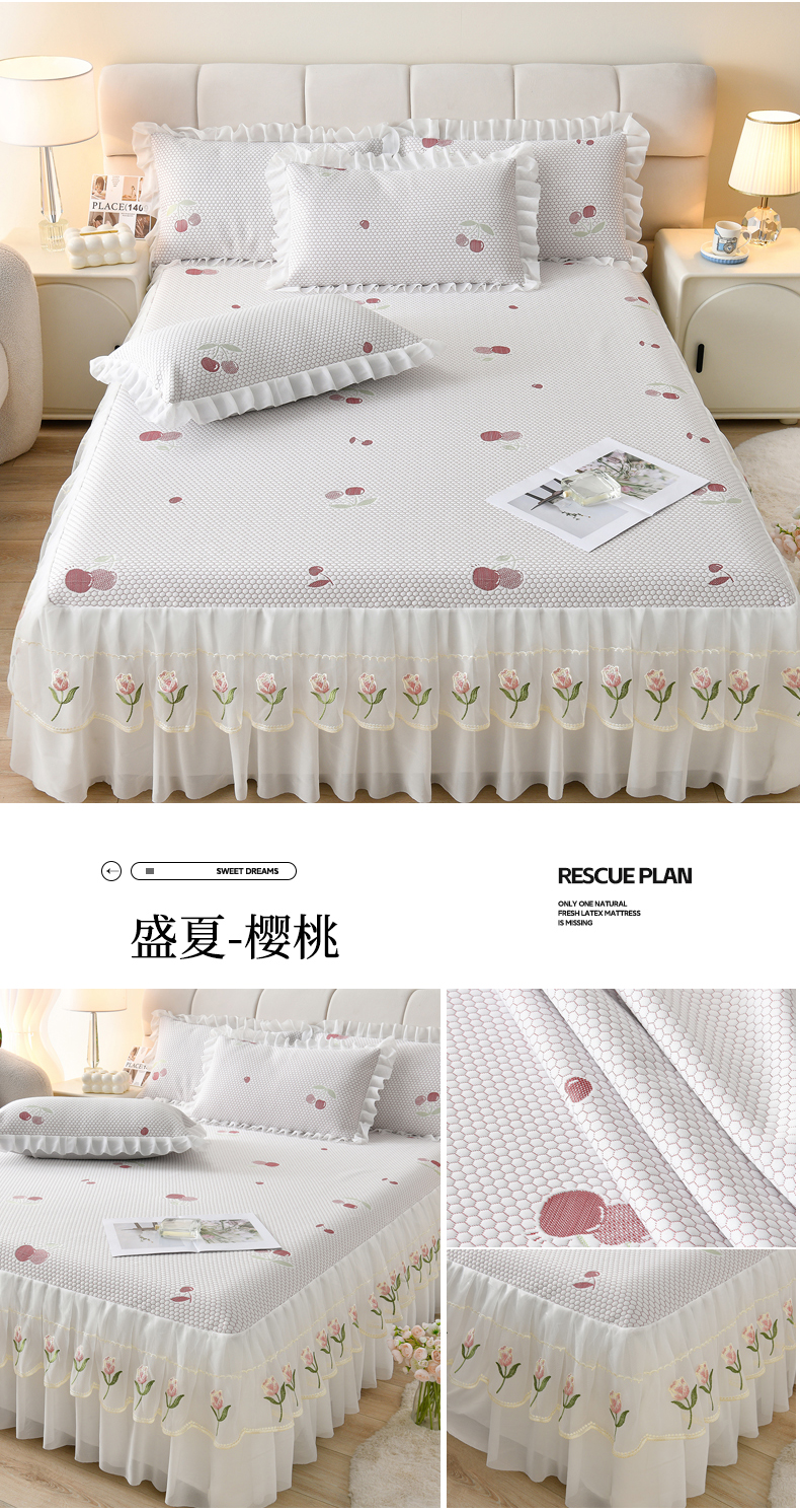 优家居工厂店 A类2026夏季冰丝席裙款豆豆凉席三件套刺绣花边蕾丝花边床裙可机洗水洗 盛夏-草莓