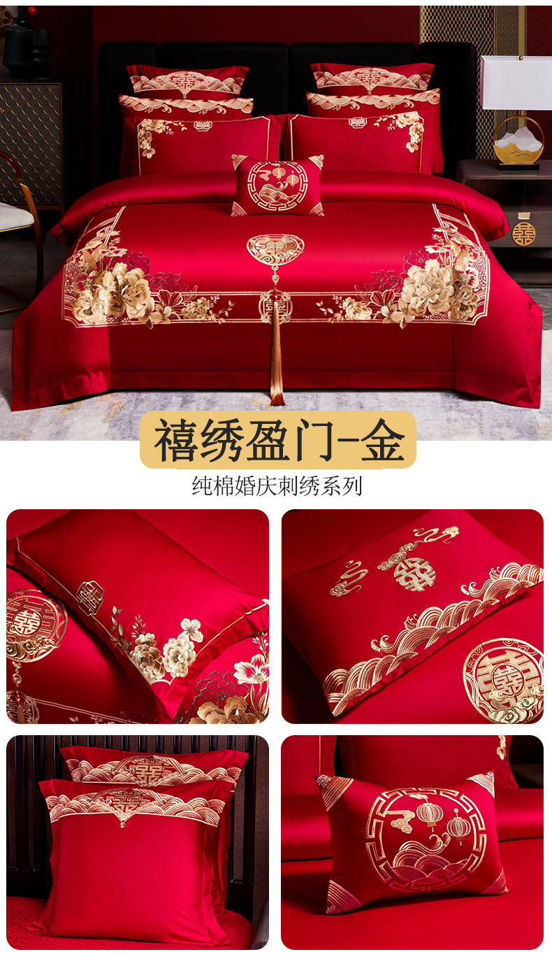 (总)红番天婚庆 2026新款全棉刺绣新中式婚庆四件套多件套,喜来多-红,禧绣盈门-金,禧绣盈门-红-时尚,禧绣盈门-红