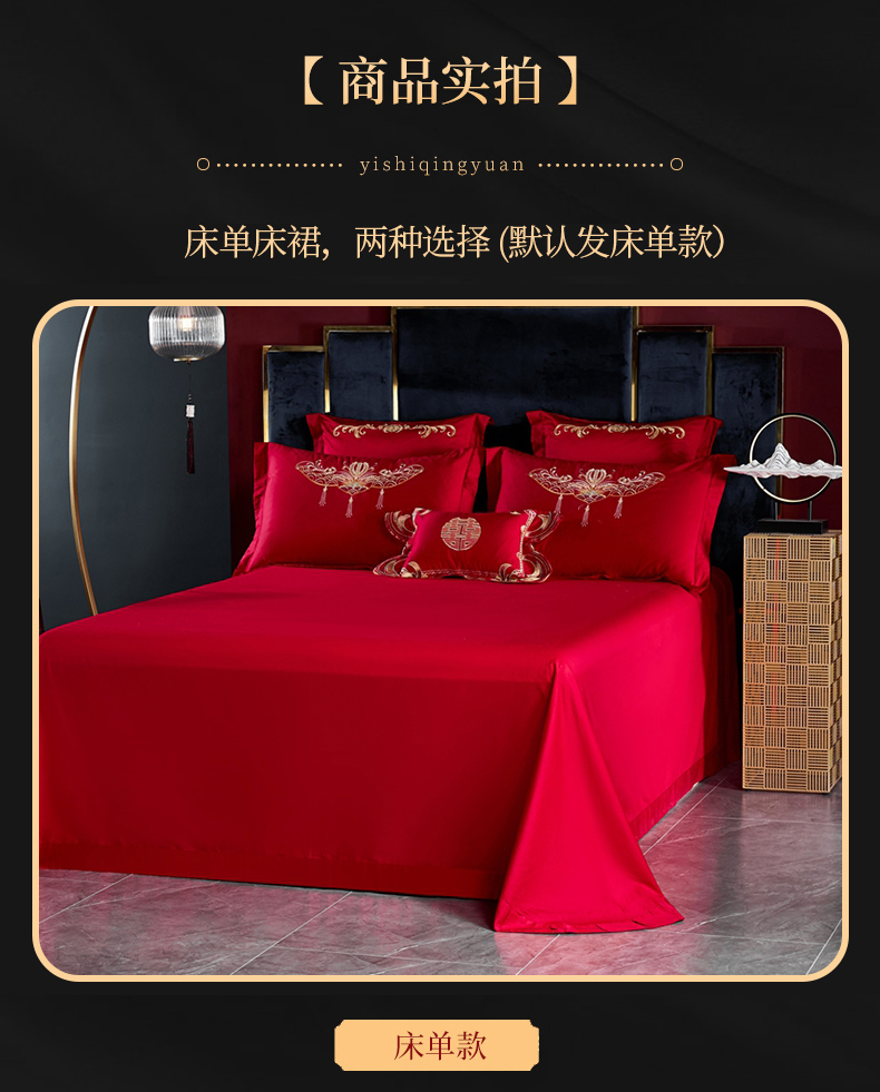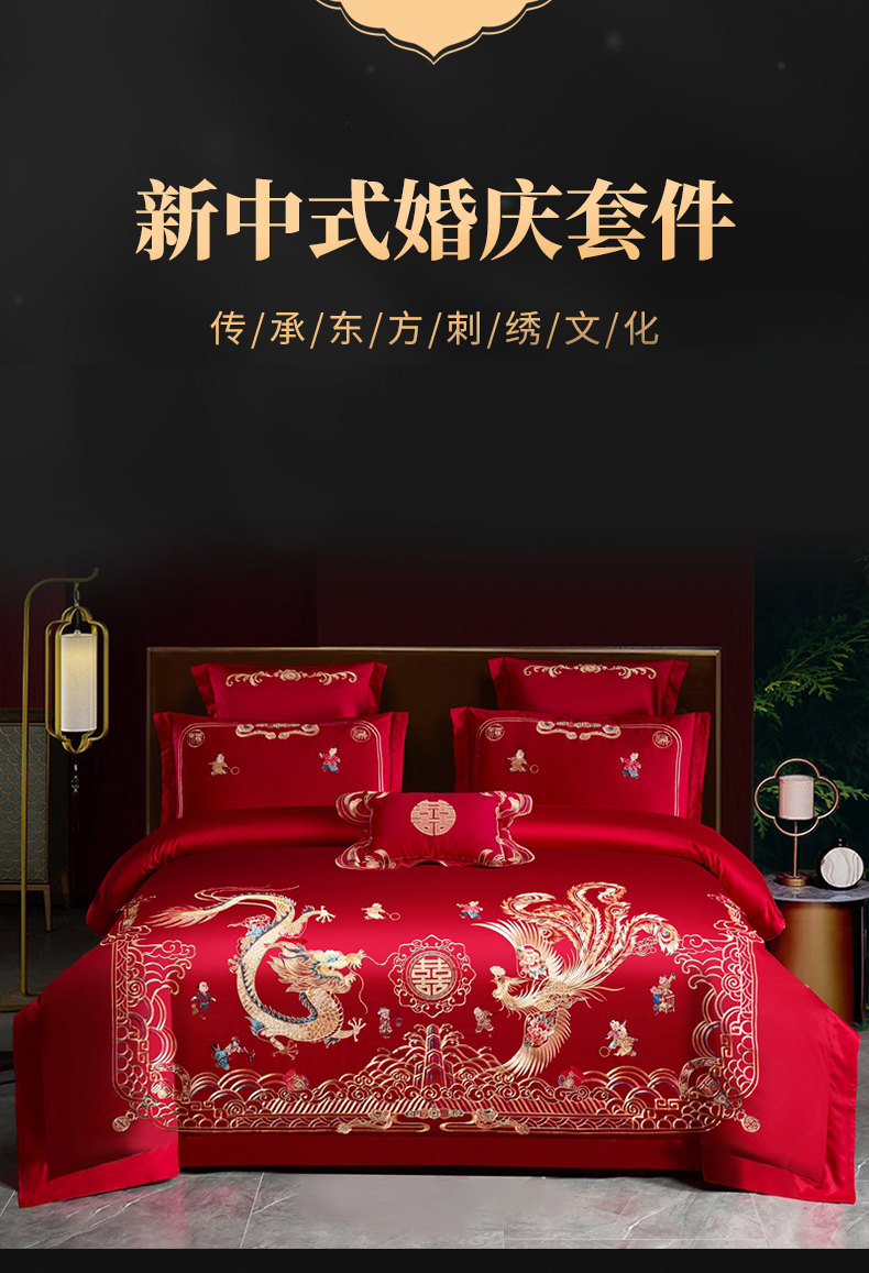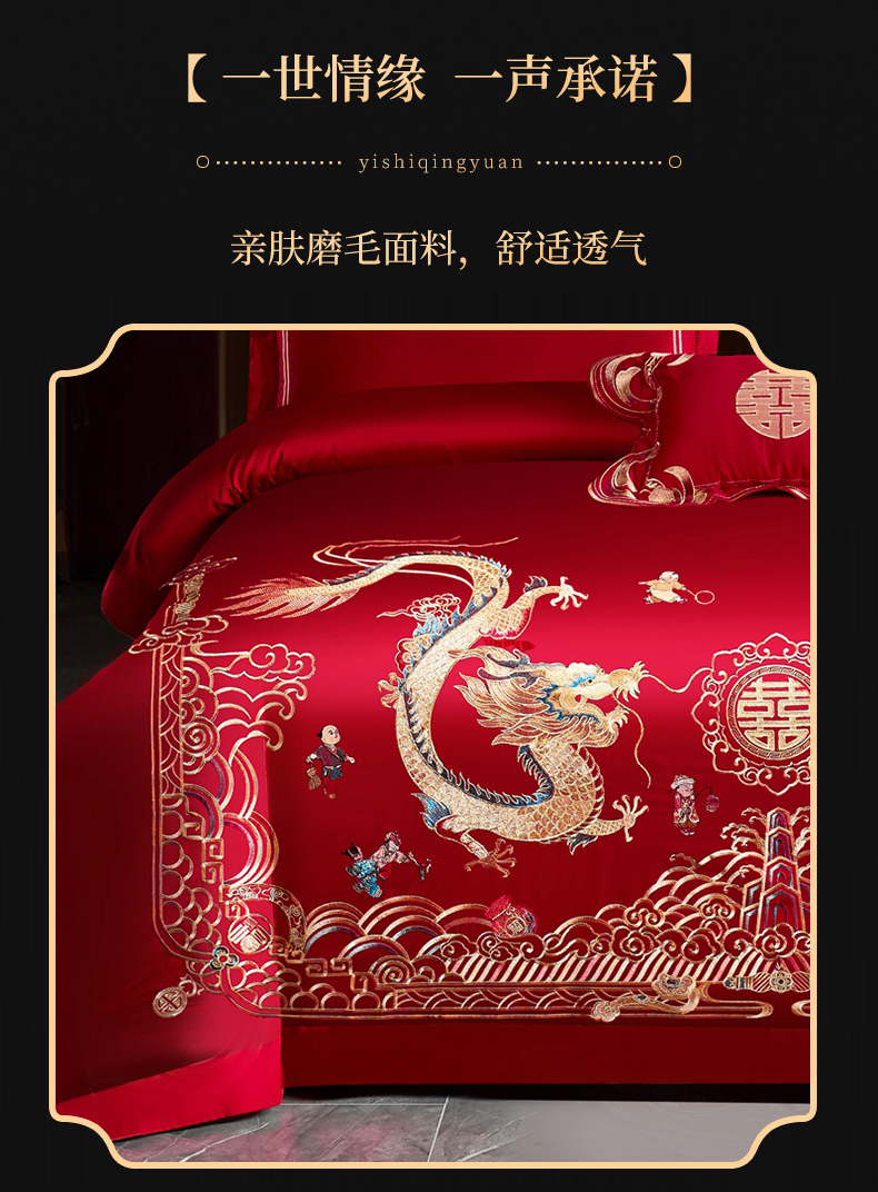 当前位置: 91家纺网 > 商品网购 > 床品套件 > 四件套 > 婚庆四件套 > 慕她家纺 2026年磨毛亲肤棉婚庆四件套大红色刺绣结床上用品 凤生百子