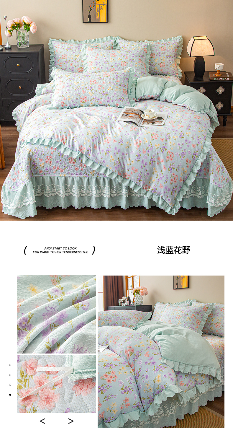 商品名称:美之润家纺 2026新款原麻夹棉床盖四件套 浅蓝花野