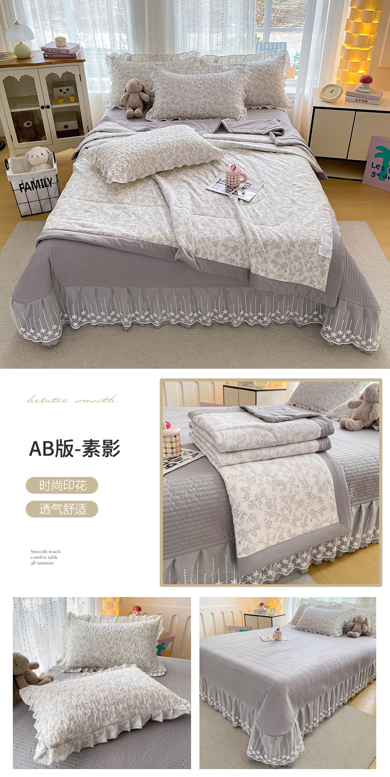 当前位置: 91家纺网 > 商品网购 > 床品套件 > 四件套 > 其它四件套 > 艺慕家纺 2026新款直播热款古法仿棉AB版水洗棉印花双层蕾丝花边夏被床盖四件套 AB版-素影