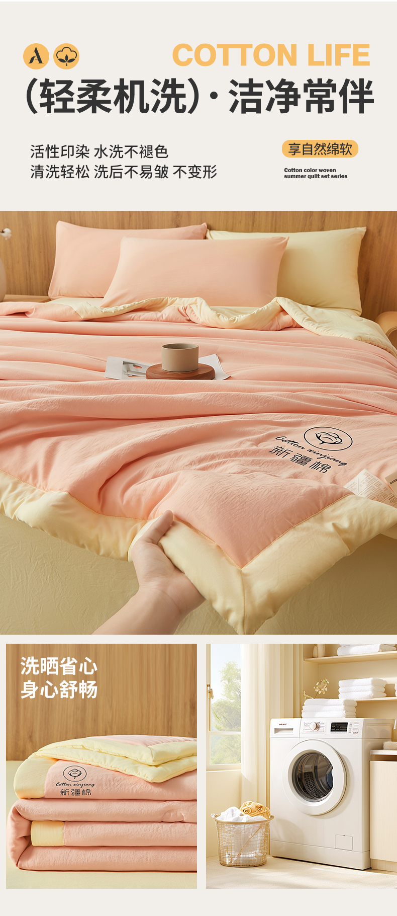 晓时候 2026新款无印风水洗棉新疆棉花被夏被夏凉被空调被子 素夏-粉黄