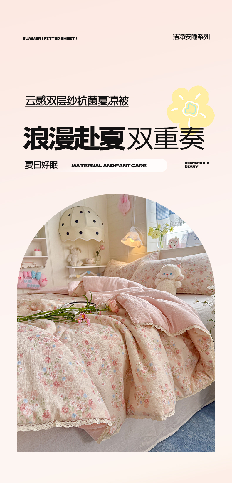 优承佳生活馆 2026新款云感双层纱抗菌夏被夏凉被空调被 相思粉韵