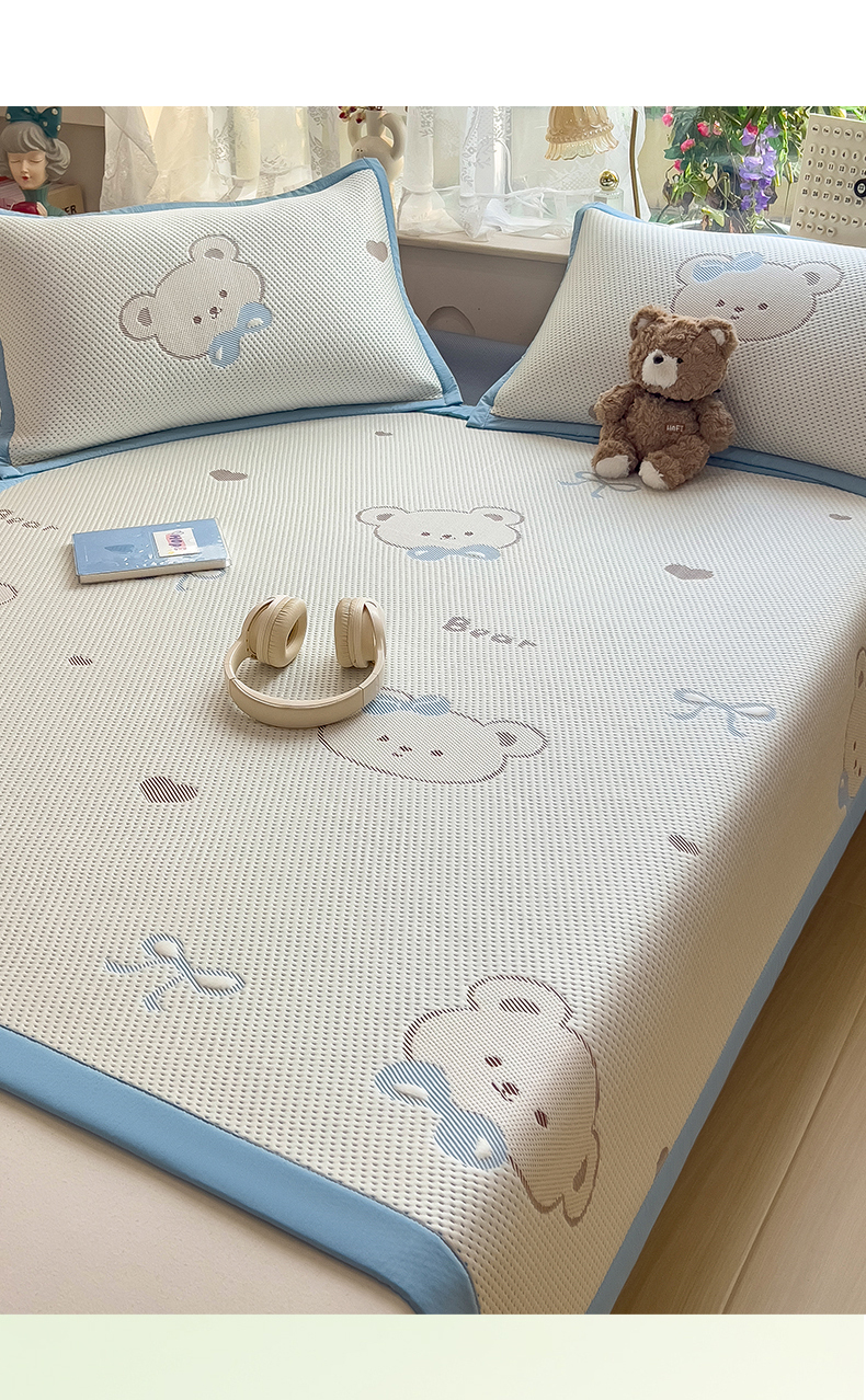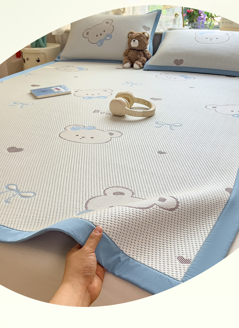 • 91家纺网 家纺一手货源 找家纺 雯豆家纺 2026新款PE中分子凉感凉席条席三件套加厚三明治款复合卡通提花凉席 PE提花凉席-领带熊