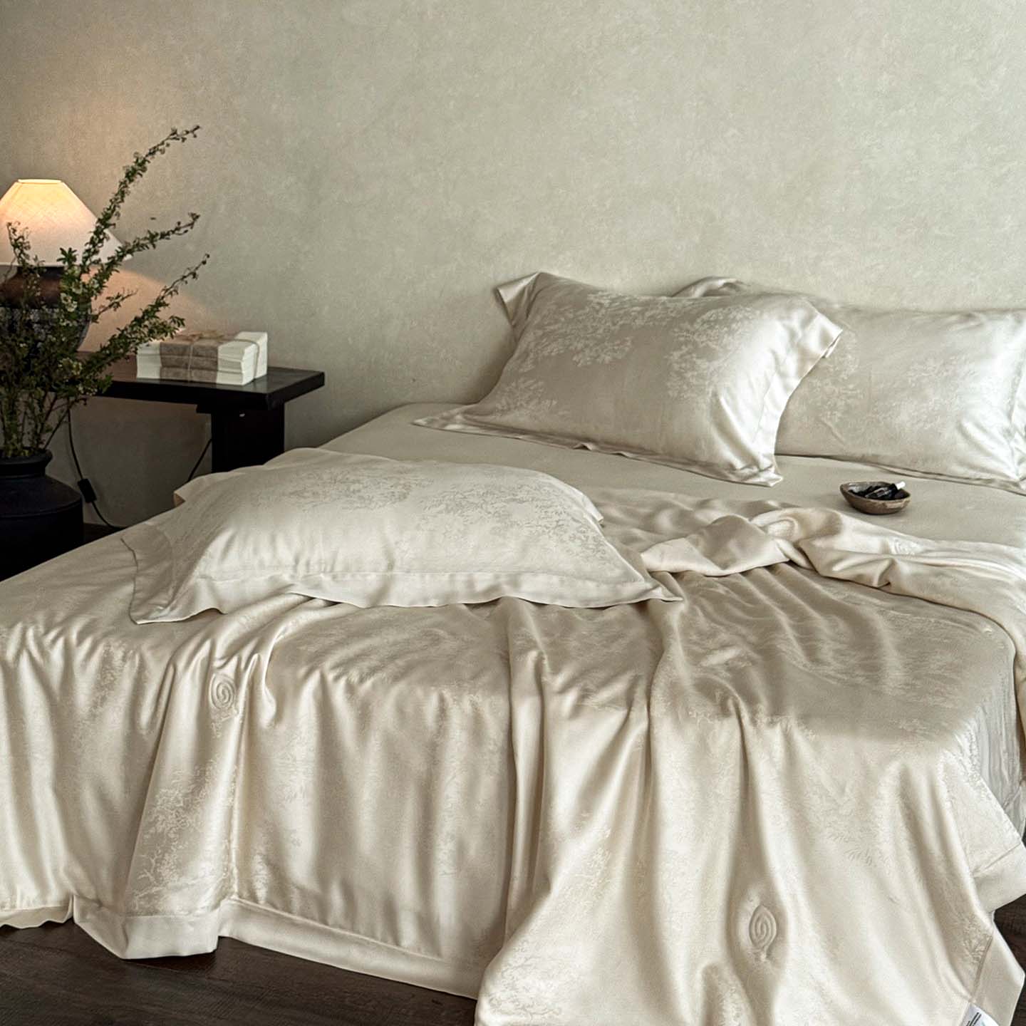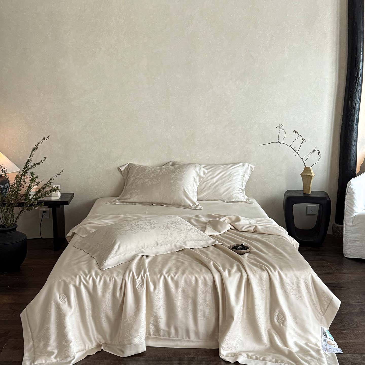 • 91家纺网 家纺一手货源 找家纺 花时间 2026新款提花夏凉被天丝赫本夏被四件套 天丝赫本夏被-香槟色