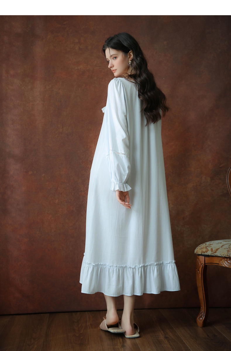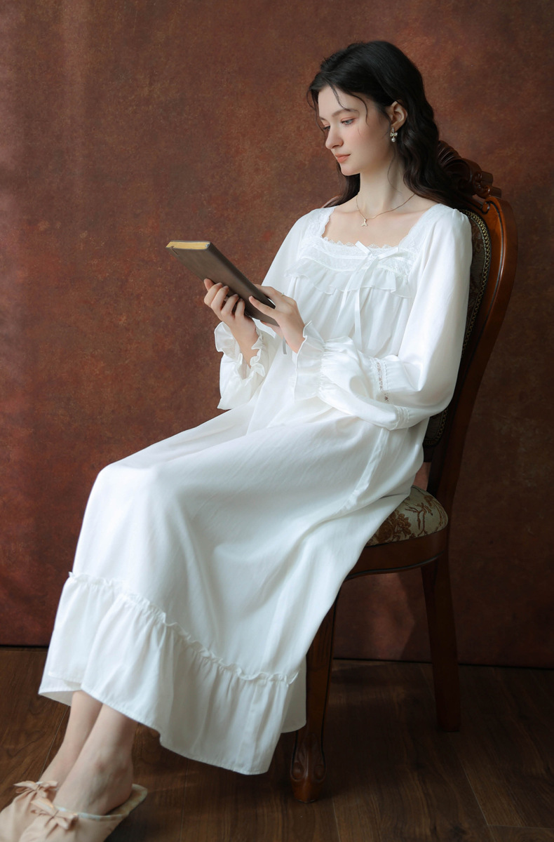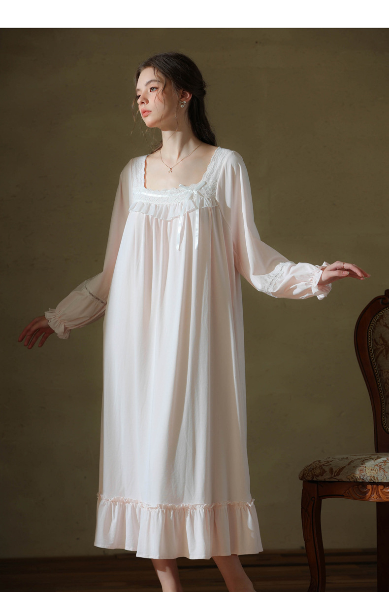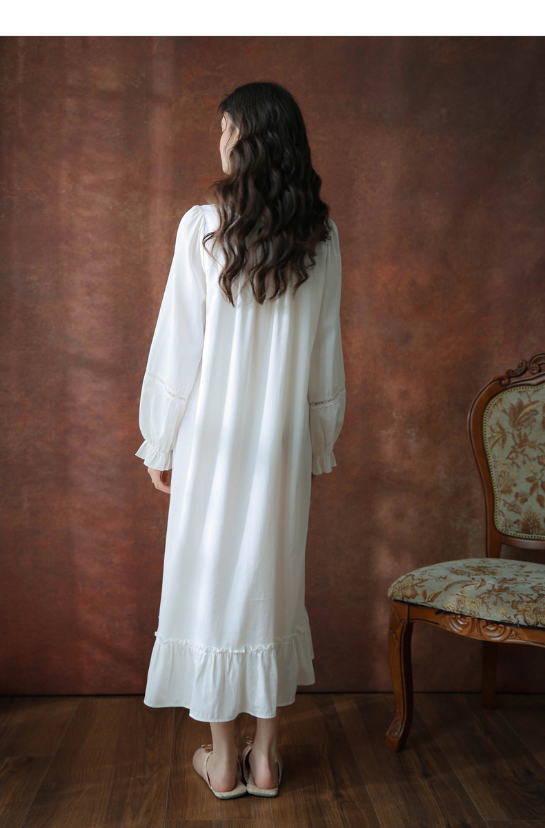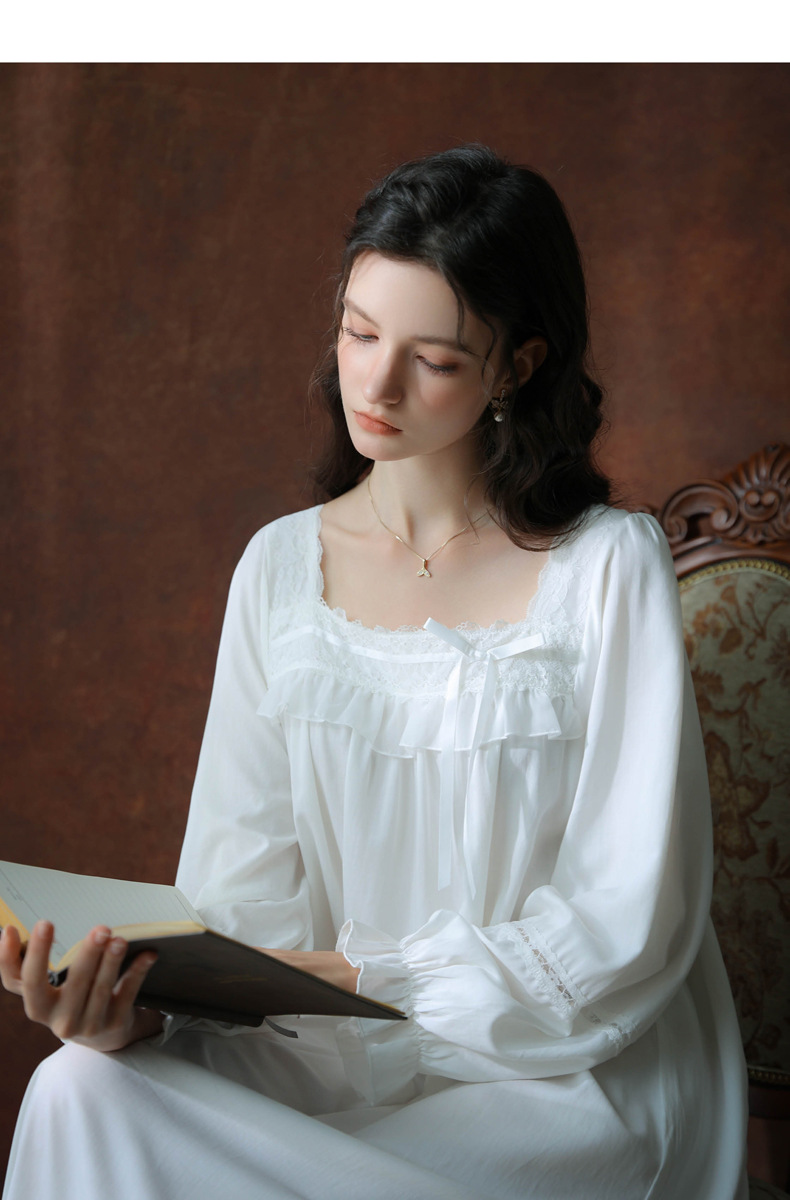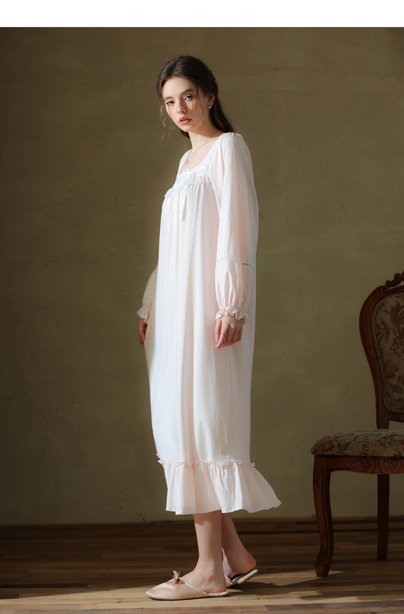 (总)洛兰沙家居馆 2026新款睡衣宫廷风少女甜美公主法式长裙春秋蕾丝跨境家居服长款睡裙,白色