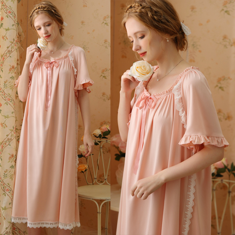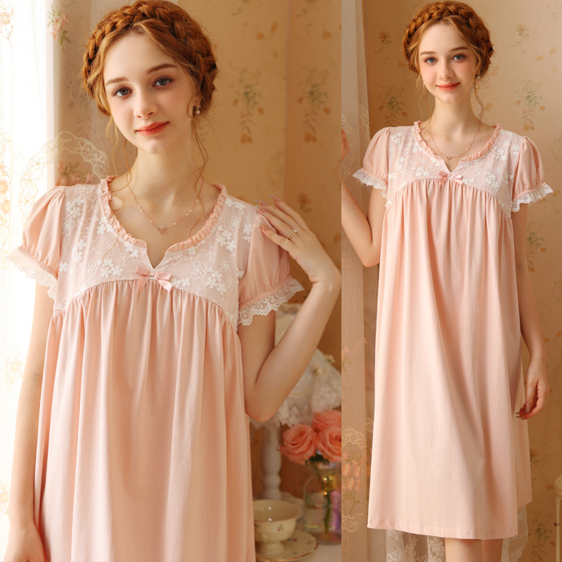 (总)洛兰沙家居馆 2026新款睡裙少女短袖法式复古公主风睡衣裙夏天新款长款柔美蕾丝宽松长裙,花色1,花色2,花色3,花色4