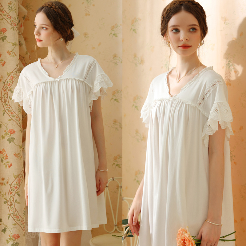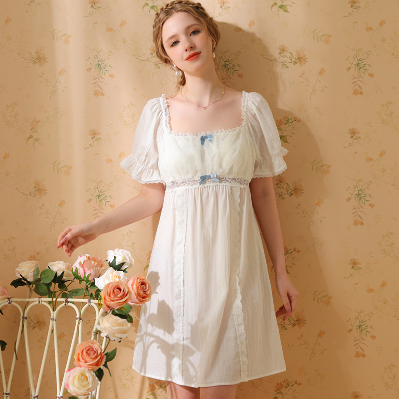 (总)洛兰沙家居馆 2026新款睡衣宫廷风少女甜美公主法式长裙春秋蕾丝跨境家居服长款睡裙,白色