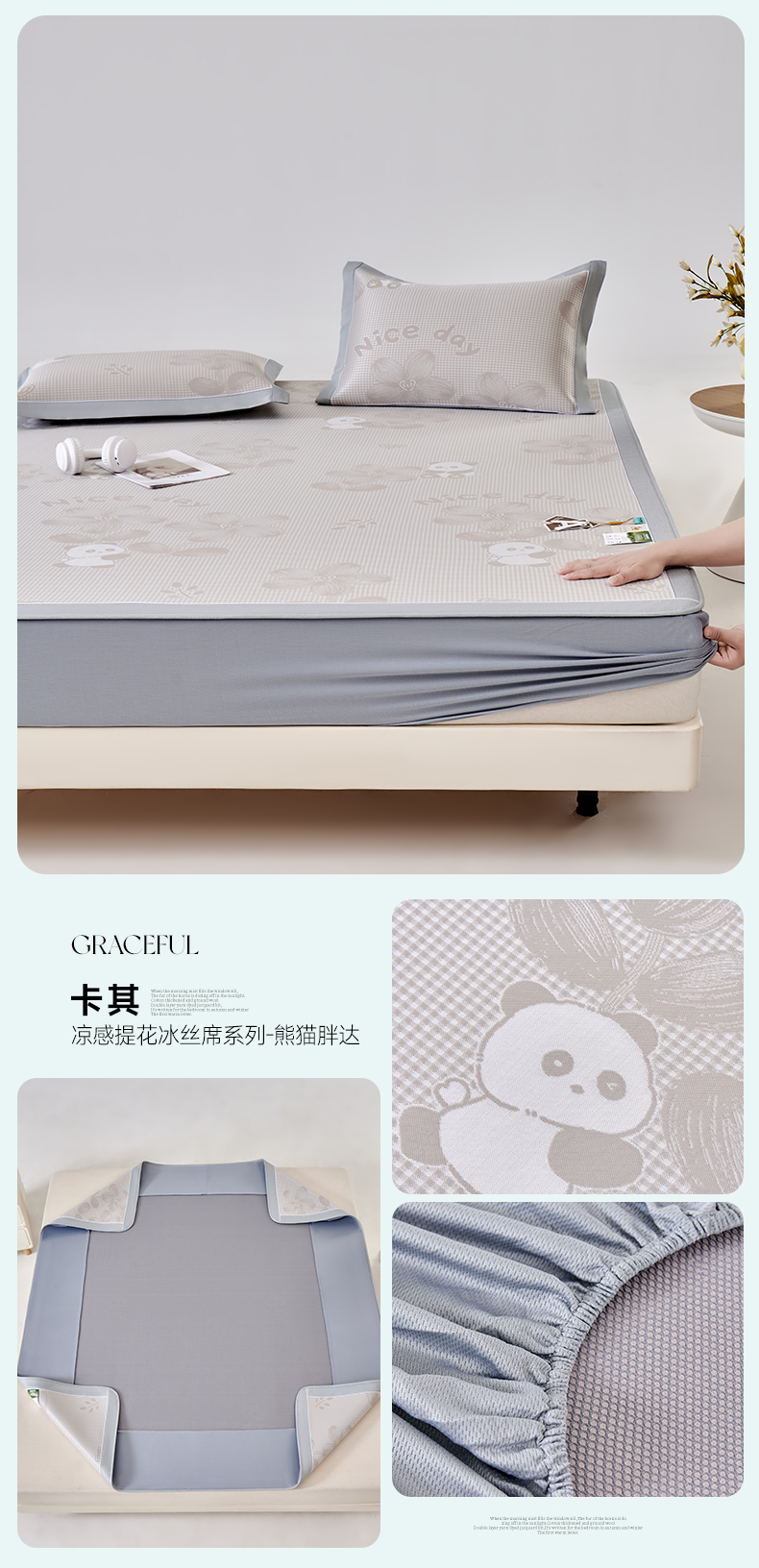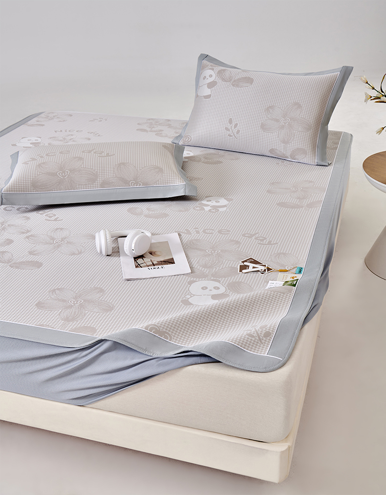 (总)小牛席业 2026新款胖达凉感提花冰丝席席子凉席-床笠款,粉色,灰色,蓝色,香槟