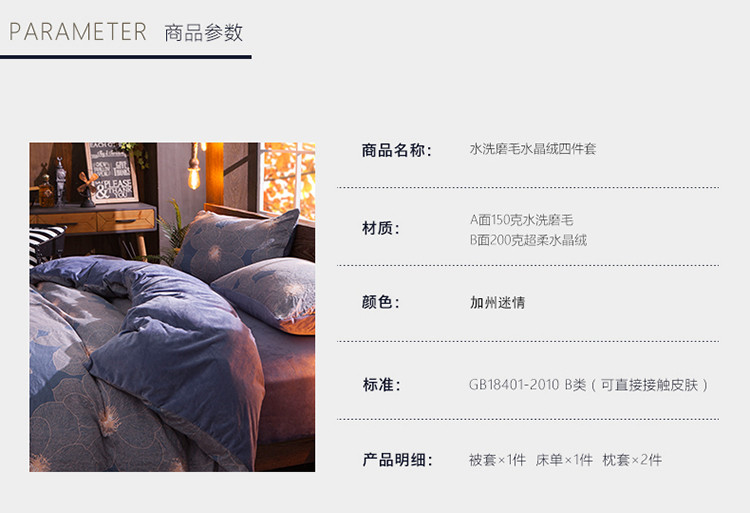 商品名称:芃成家纺 水洗磨毛加绒四件套 加州迷情