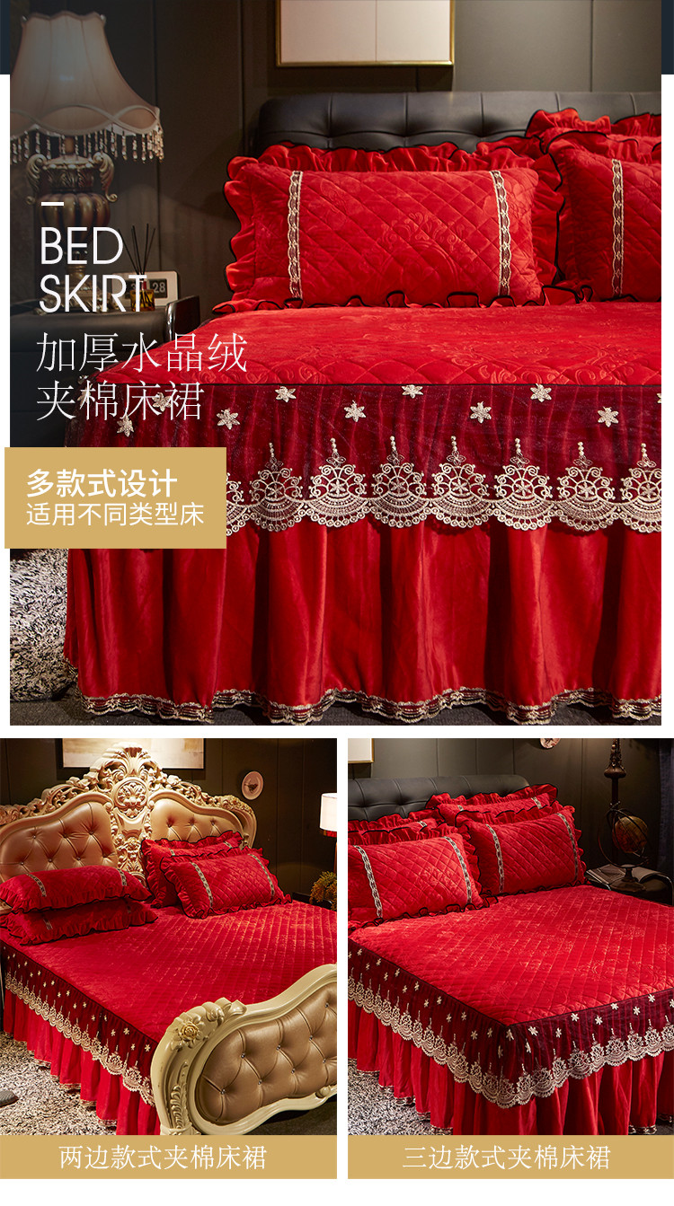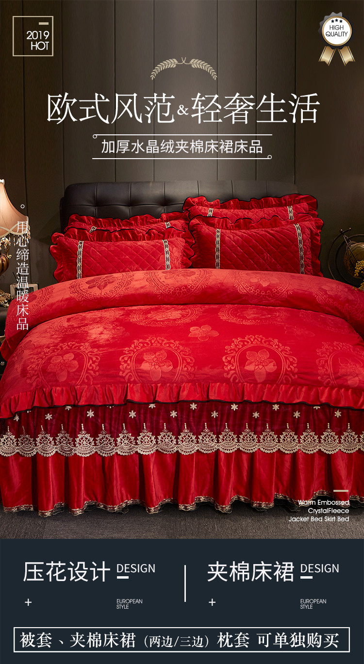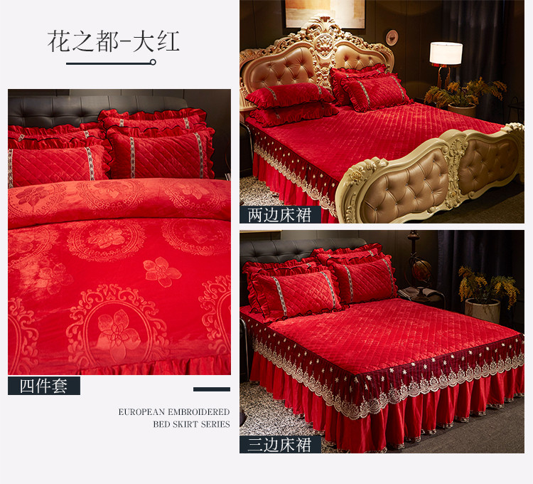 商品名称:宜凡家纺 2019新款水晶绒夹棉床裙四件套 花之都-大红
