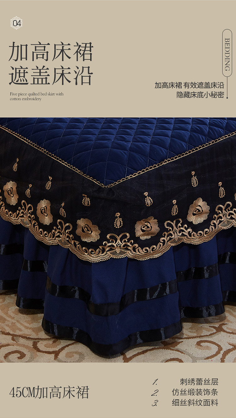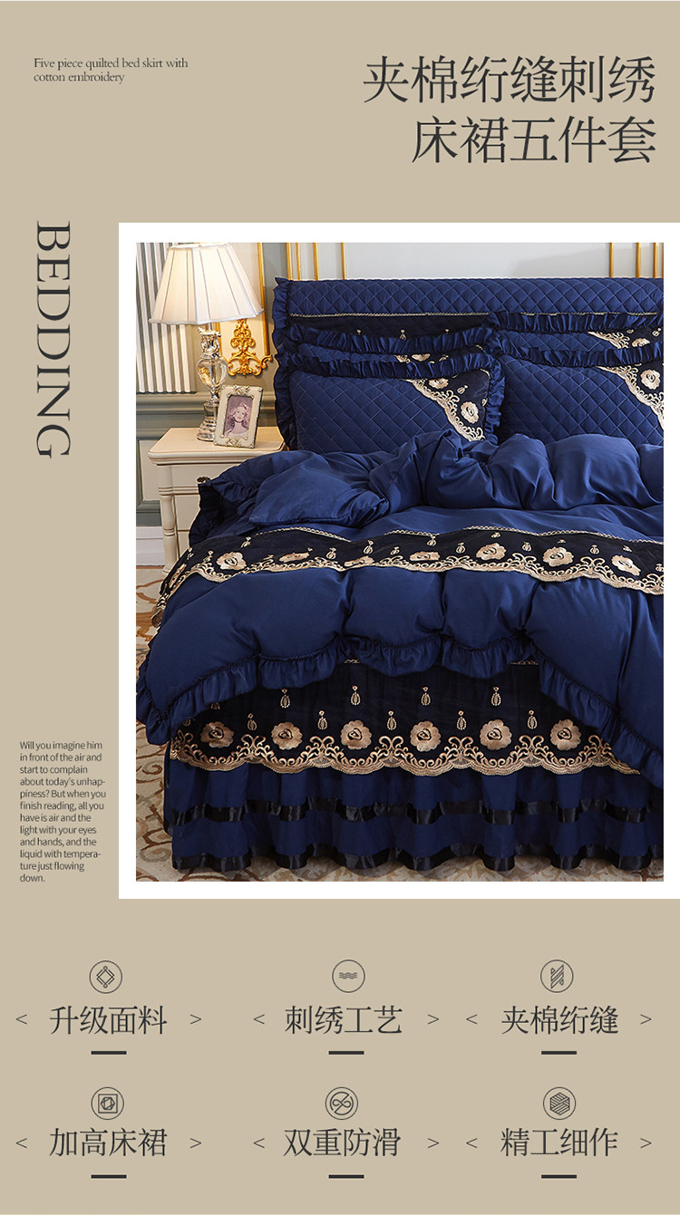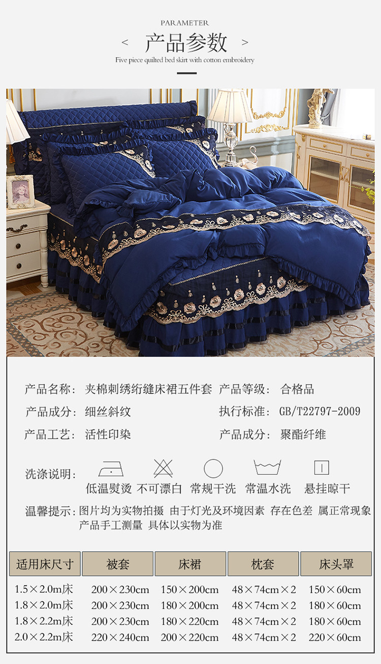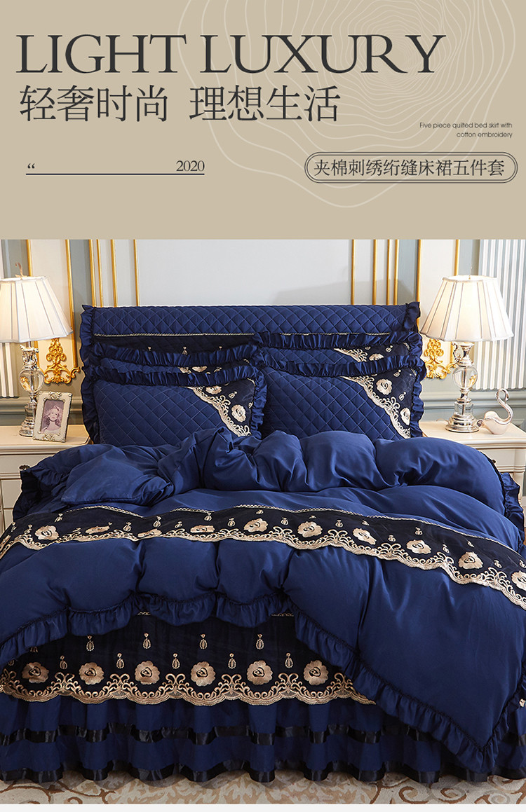 商品名称:情恒家纺2025新款四季款细丝斜纹夹棉床裙五件套 宝蓝