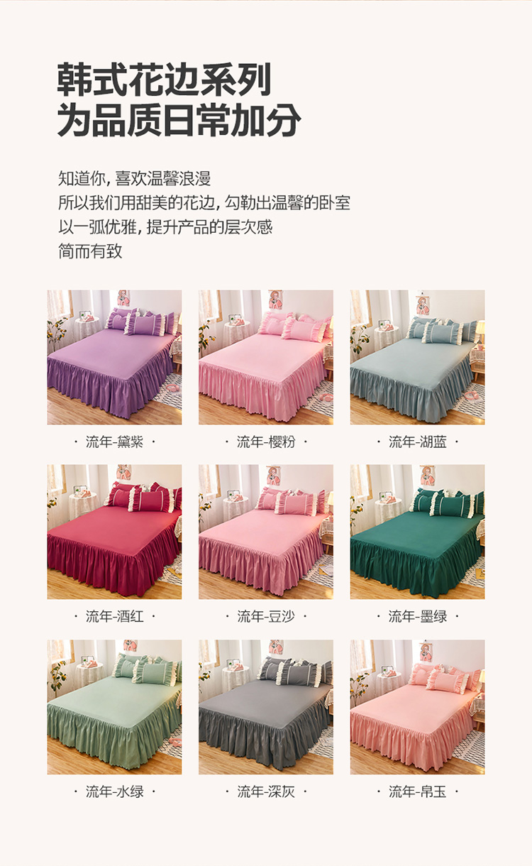 (总)2025新款莉莉安流年系列床裙三件套四件套韩版四件套,流年-帛玉,流年-黛紫,流年-豆沙,流年-湖蓝,流年-酒红,流年-墨绿,流年-深灰,流年-水绿,流年-樱粉