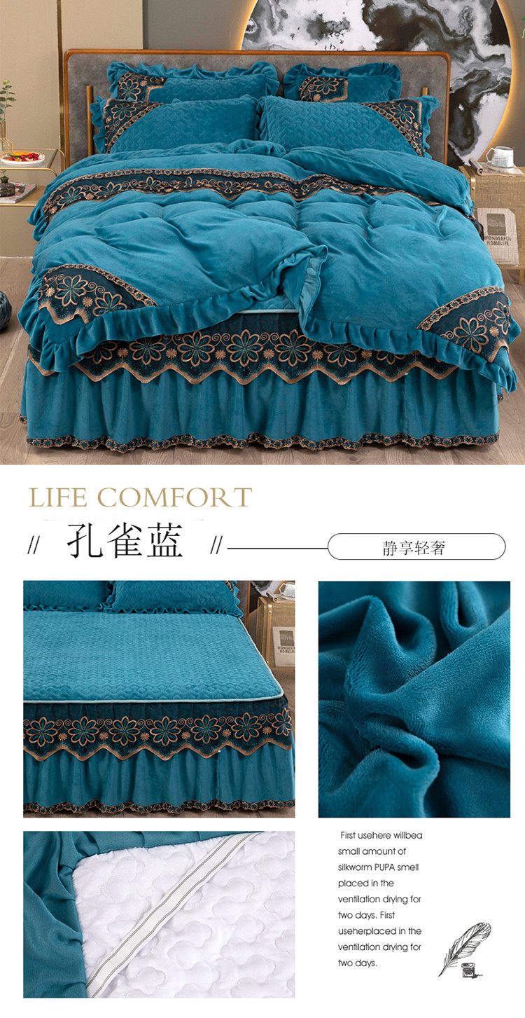 商品名称:(总)木兰花 220克保暖加厚牛奶绒蕾丝刺绣夹棉床裙款四件套