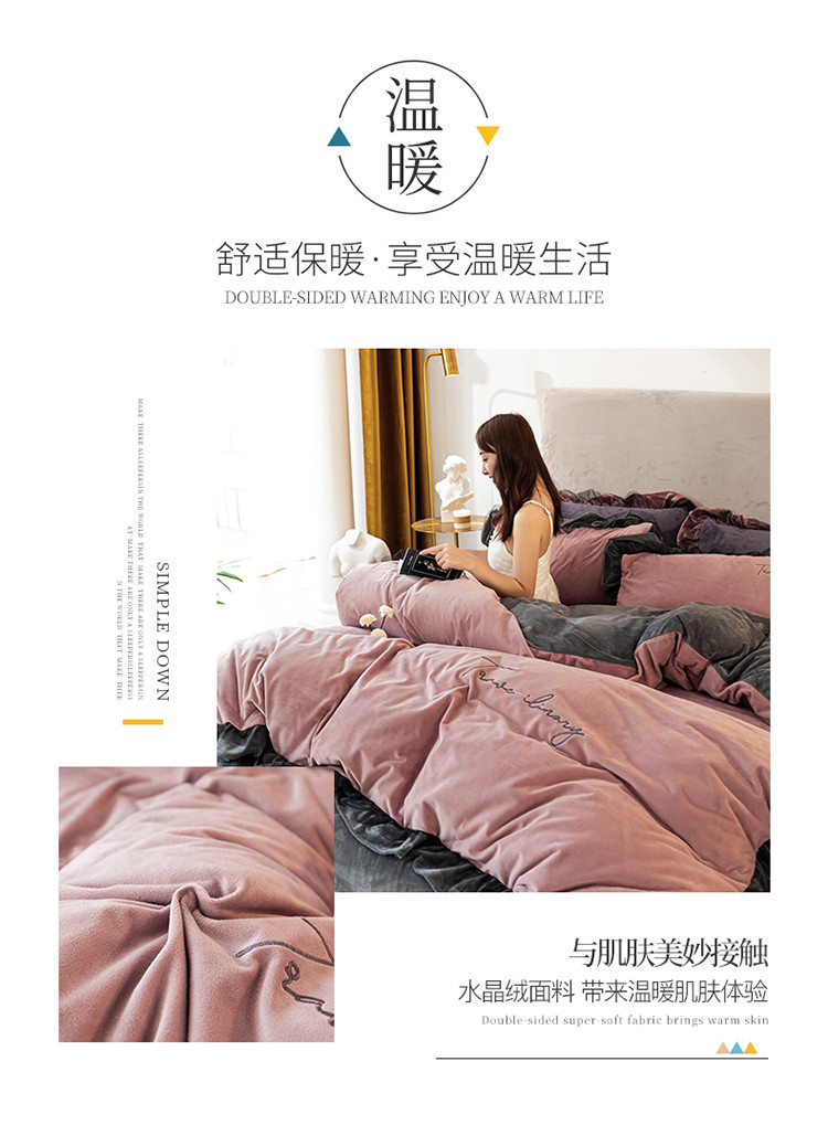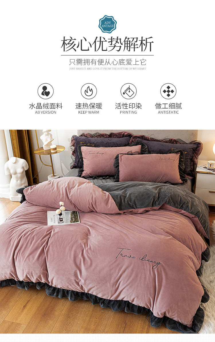 蓝巢家纺 2021新款水晶绒蕾丝边四件套 绒-豆沙深灰