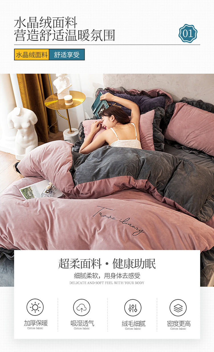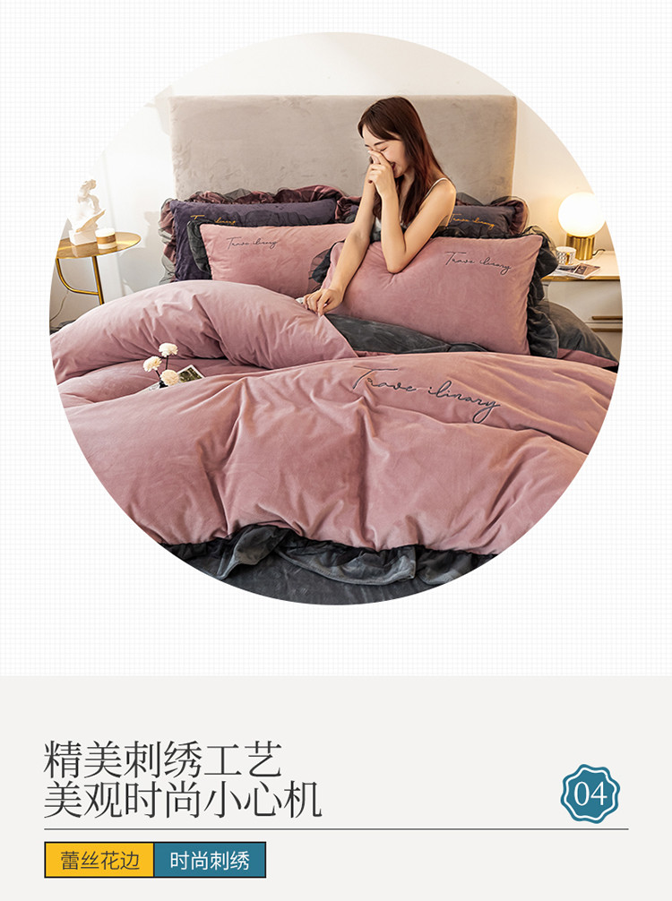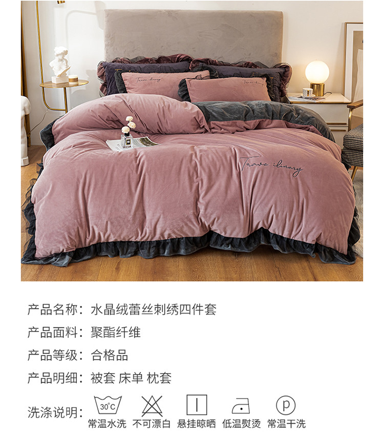 商品名称:蓝巢家纺 2021新款水晶绒蕾丝边四件套 绒-豆沙深灰