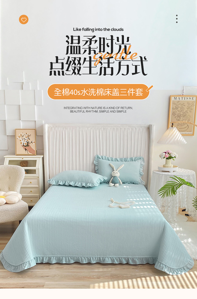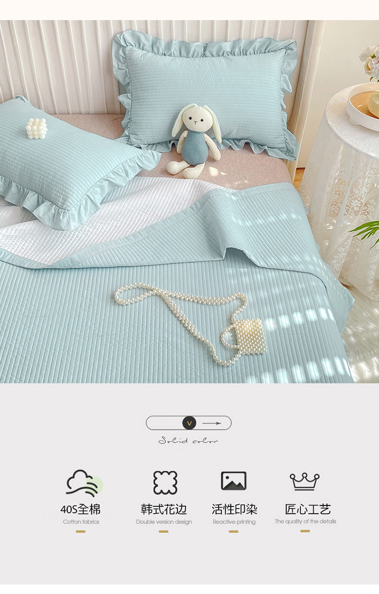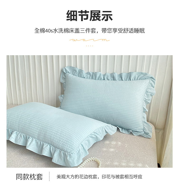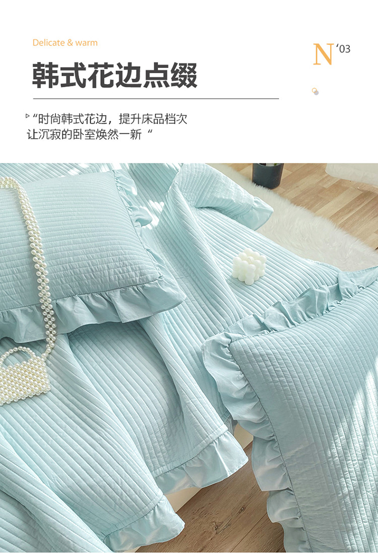 当前位置: 91家纺网 > 商品网购 > 床品套件 > 三件套 > 其奥 2025新款40S全棉水洗棉韩版荷叶边夹棉床盖三件套 海盐蓝