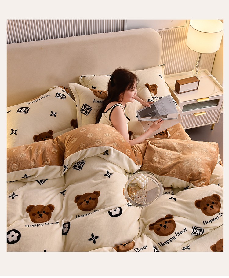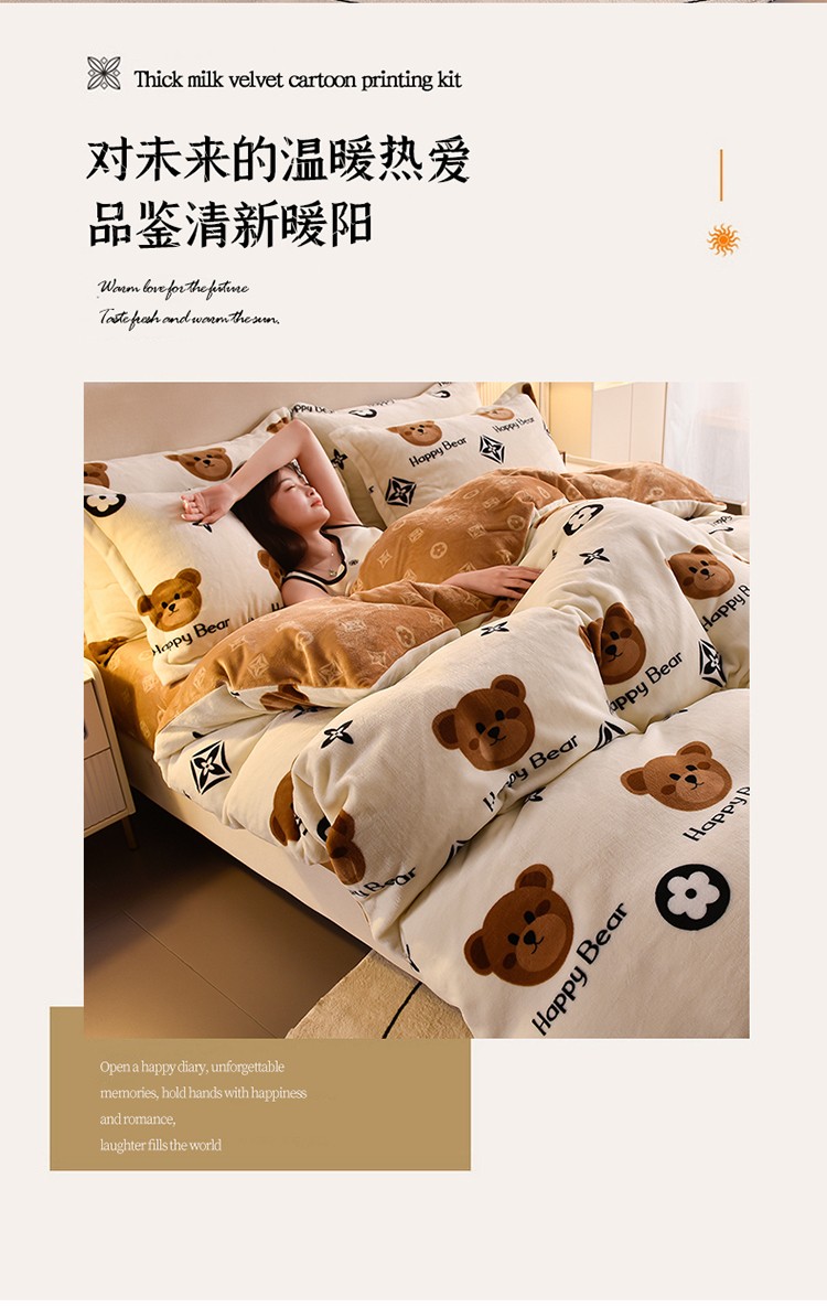 同田 2023新款牛奶金貂绒四件套印花保暖法莱水晶绒 快乐熊