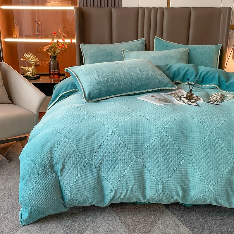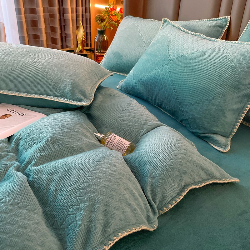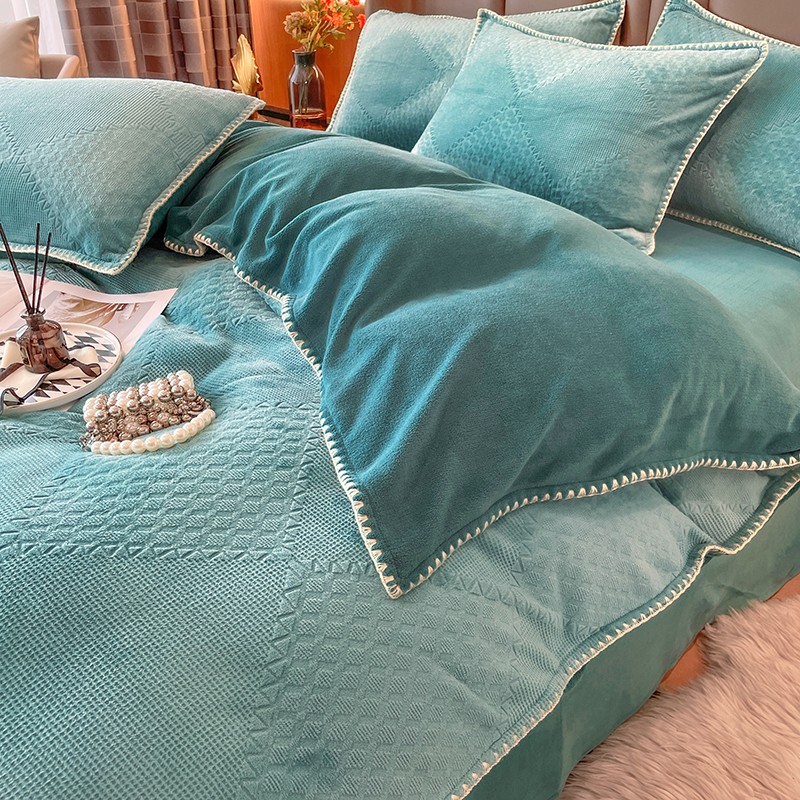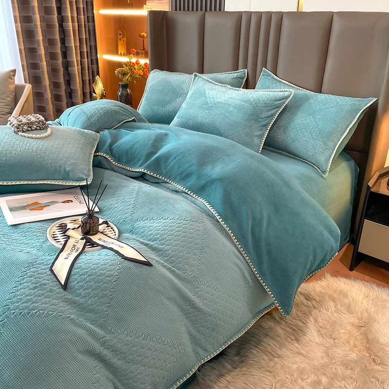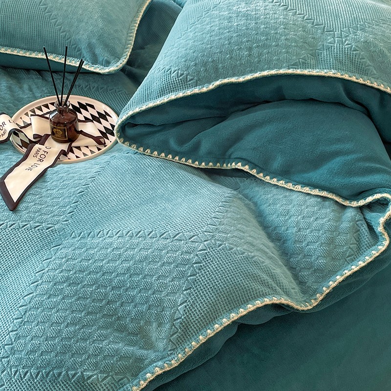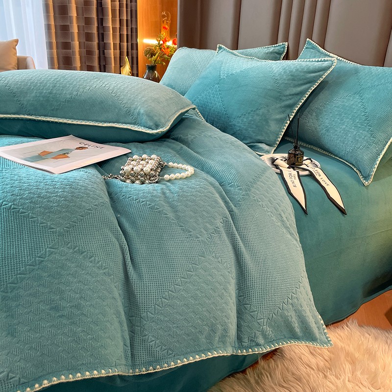商品名称:金丝鸟 2022新款200克华夫格雕花牛奶绒贝壳边四件套 华夫格绿