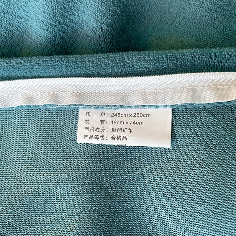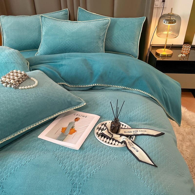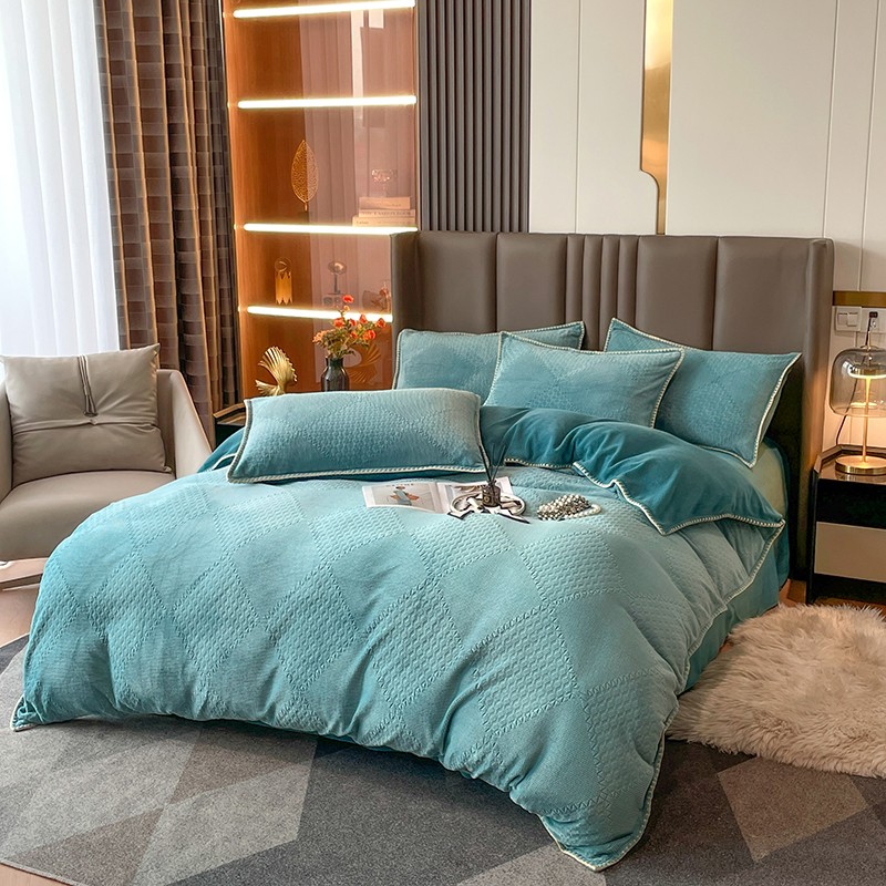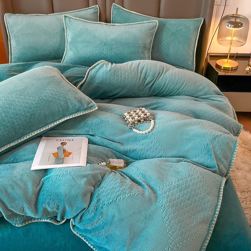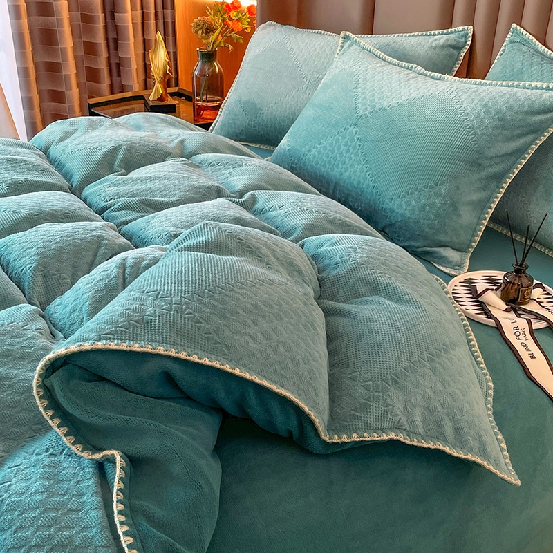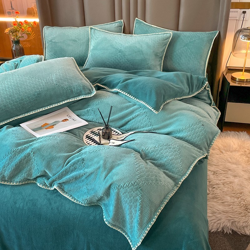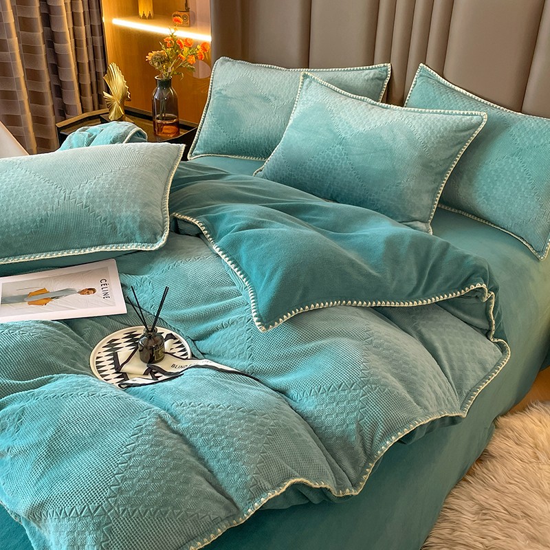 商品名称:金丝鸟 2022新款200克华夫格雕花牛奶绒贝壳边四件套 华夫格绿