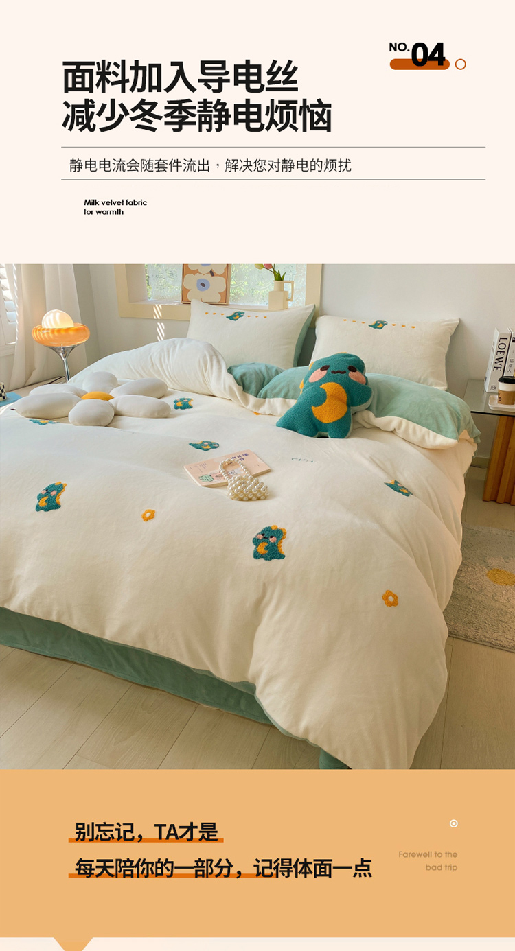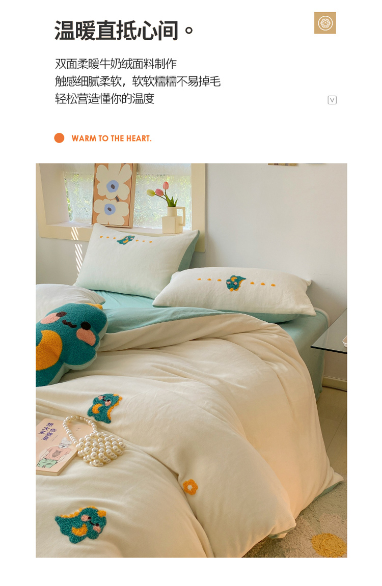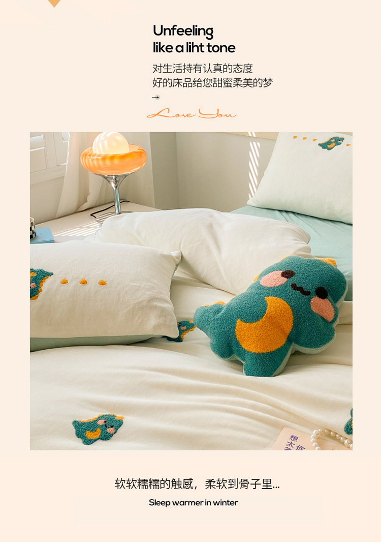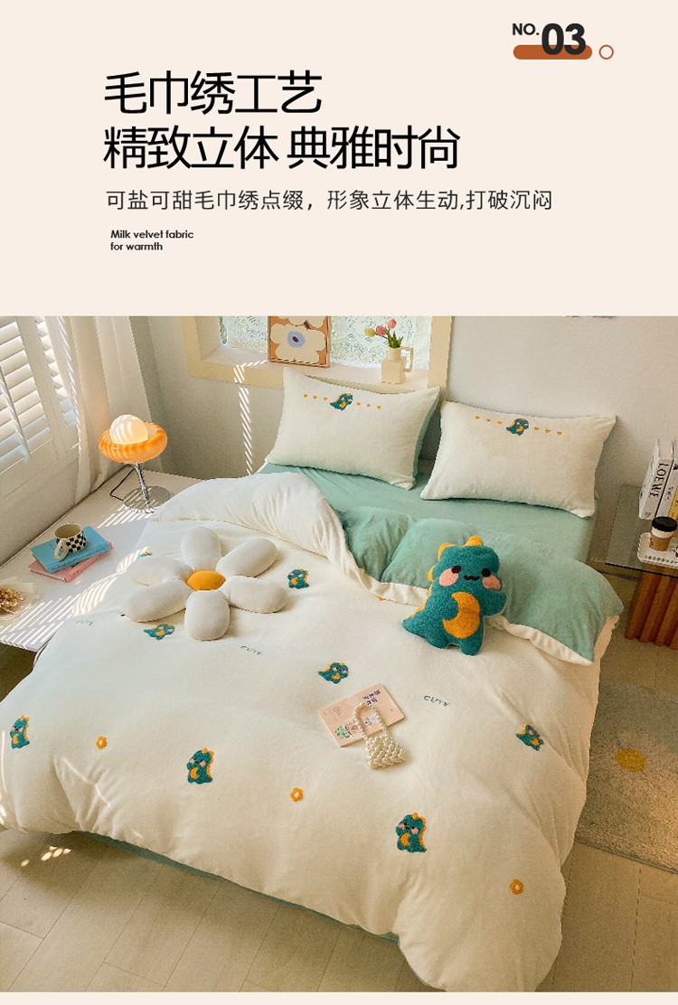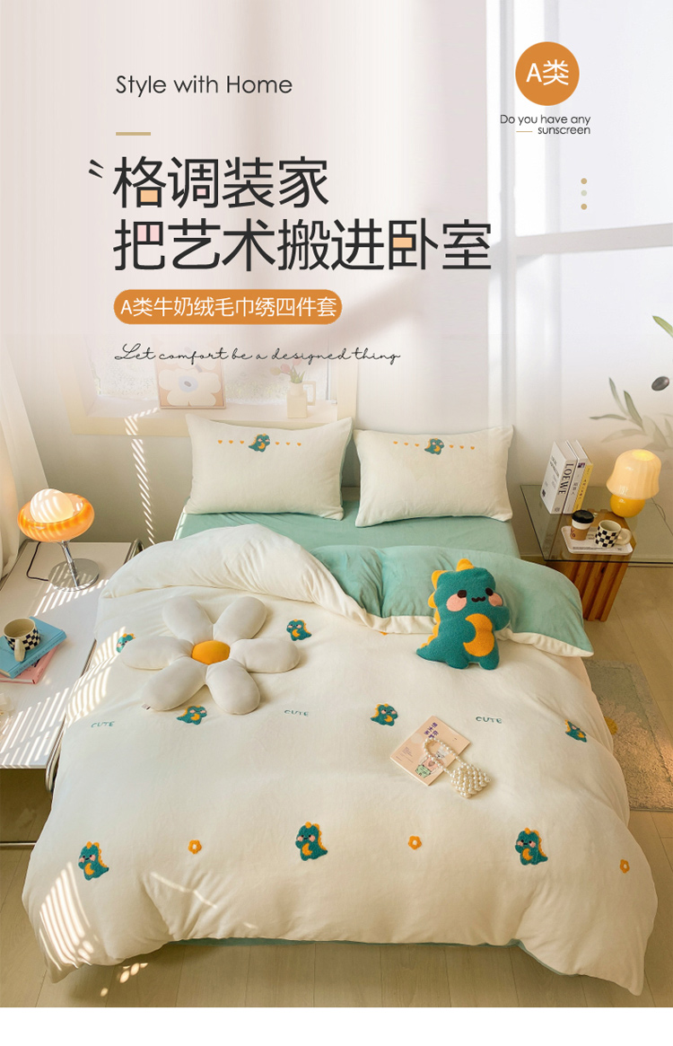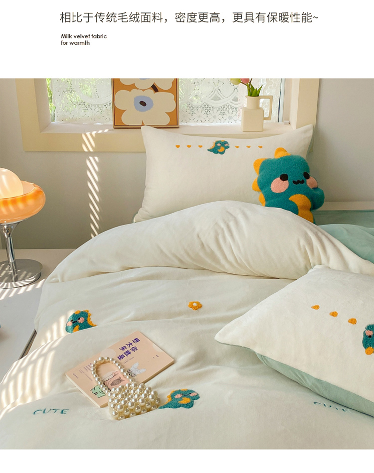 商品名称:寐居 2022新款A类牛奶绒毛巾绣四件套 萌宠恐龙-绿