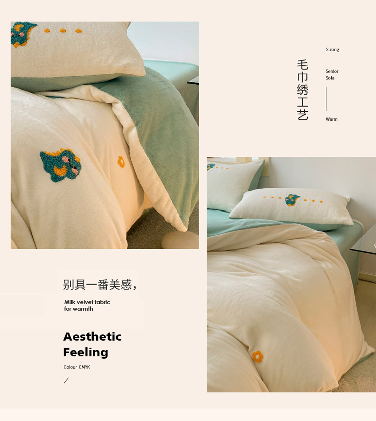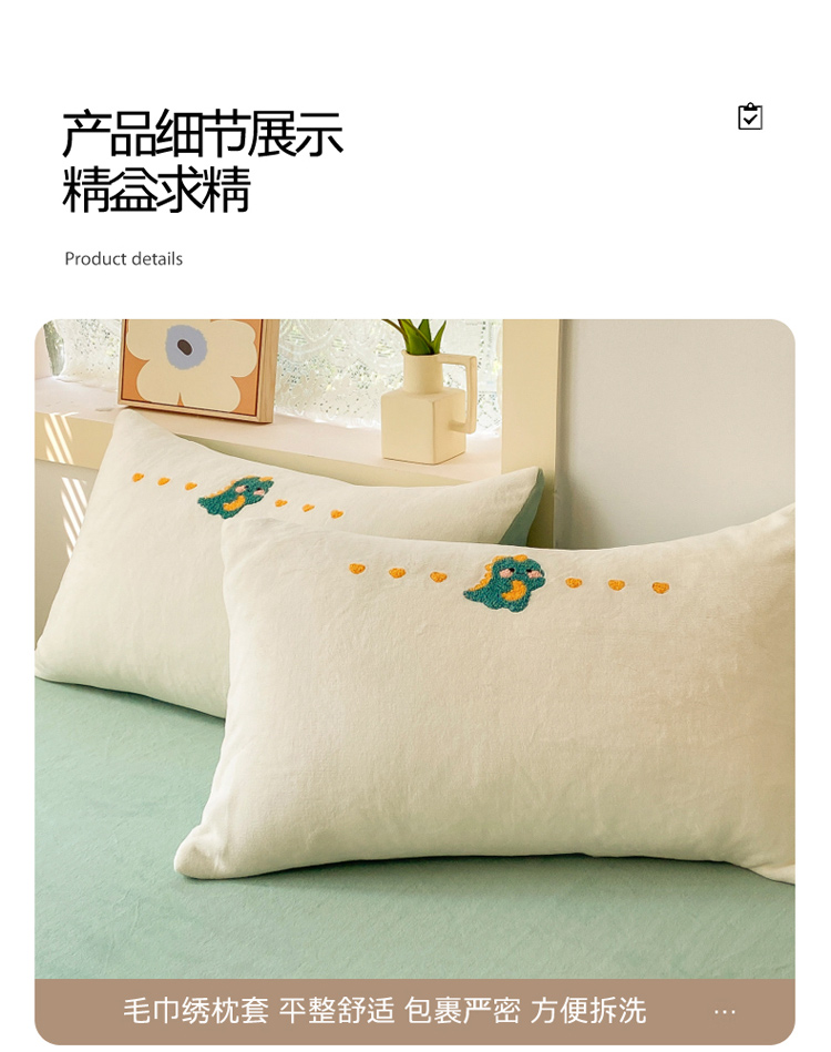寐居 2022新款A类牛奶绒毛巾绣四件套 萌宠恐龙-绿
