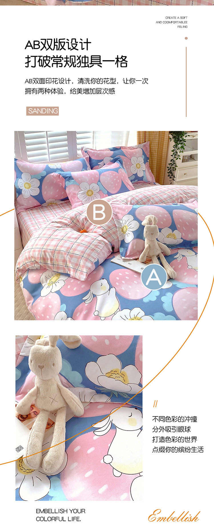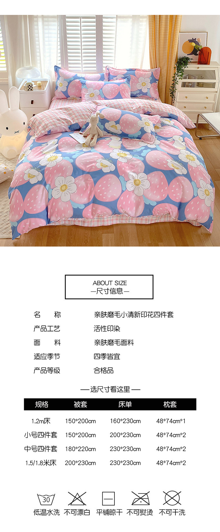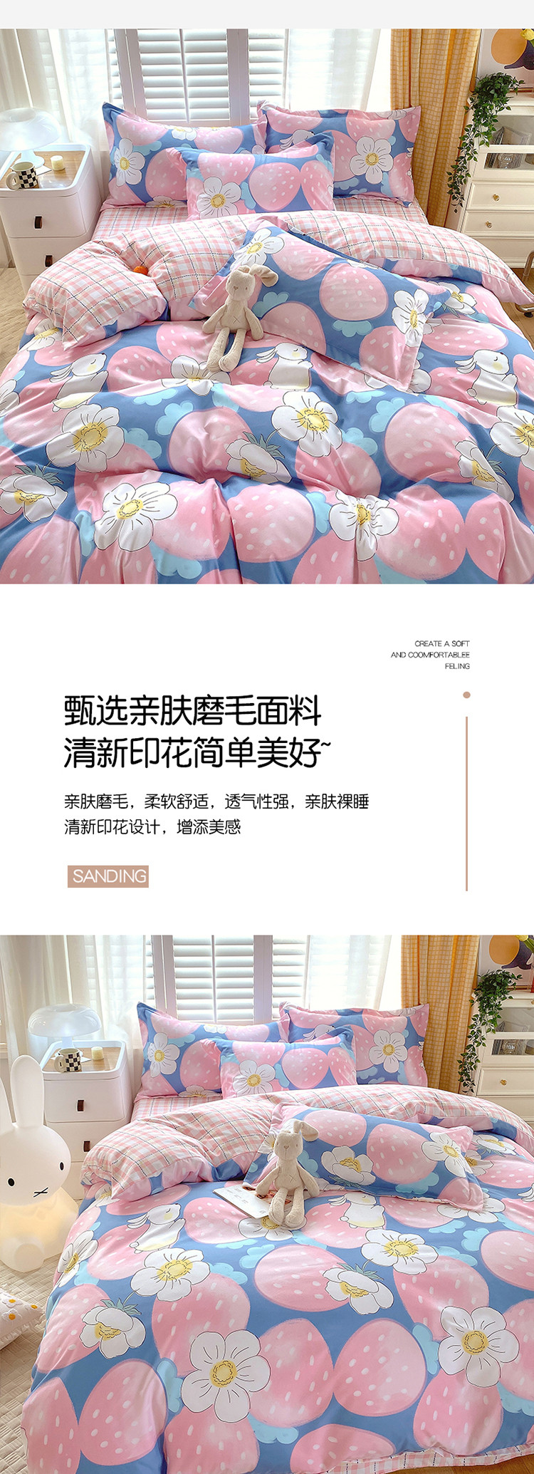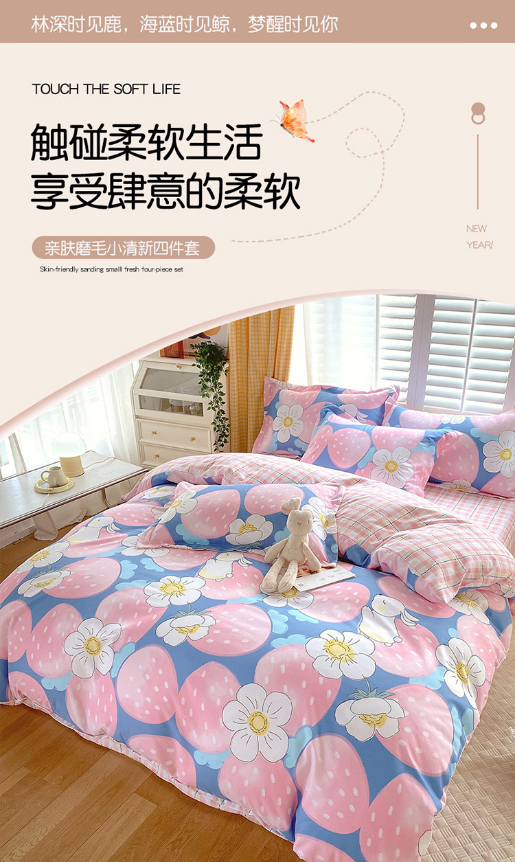 当前位置: 91家纺网 > 商品网购 > 床品套件 > 四件套 > 化纤普通四件套 > 艾橙2022秋冬新款140g植物羊绒磨毛四件套系列草莓爱恋