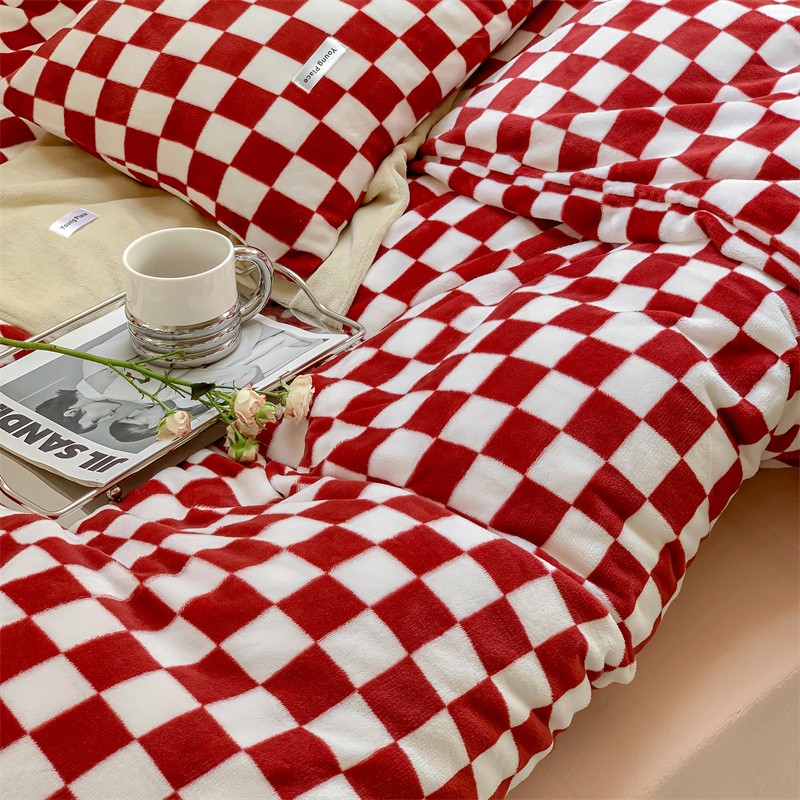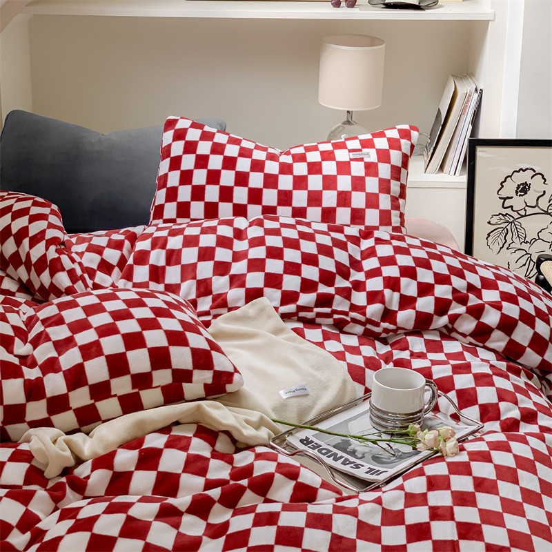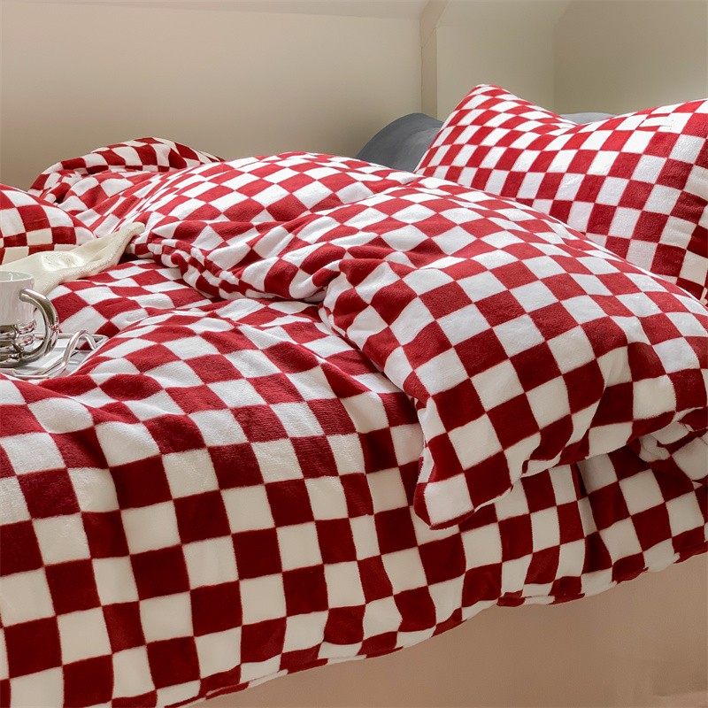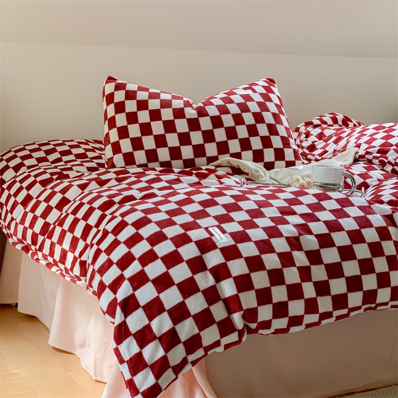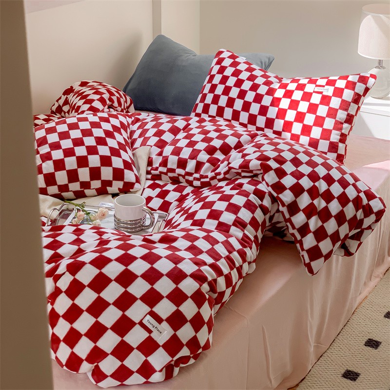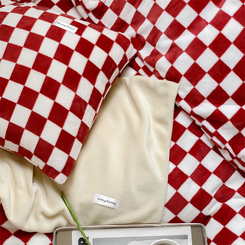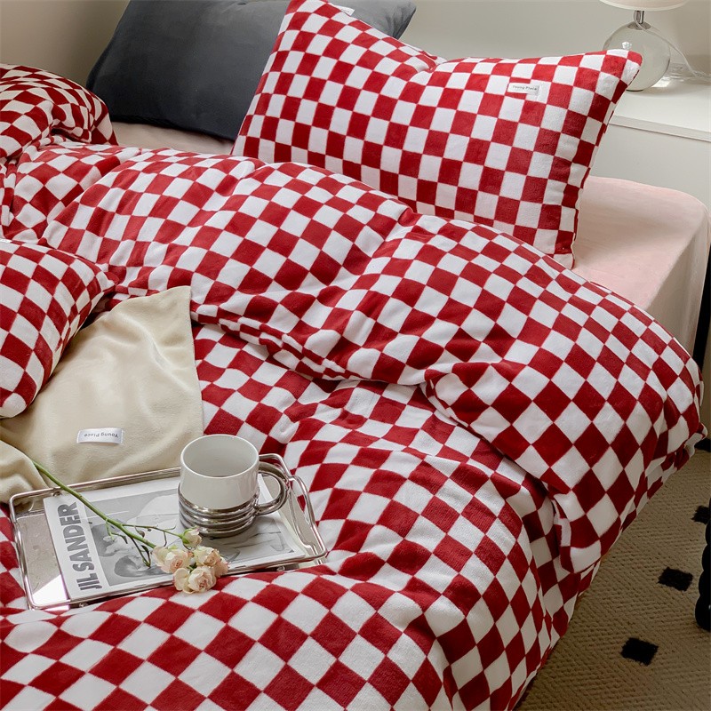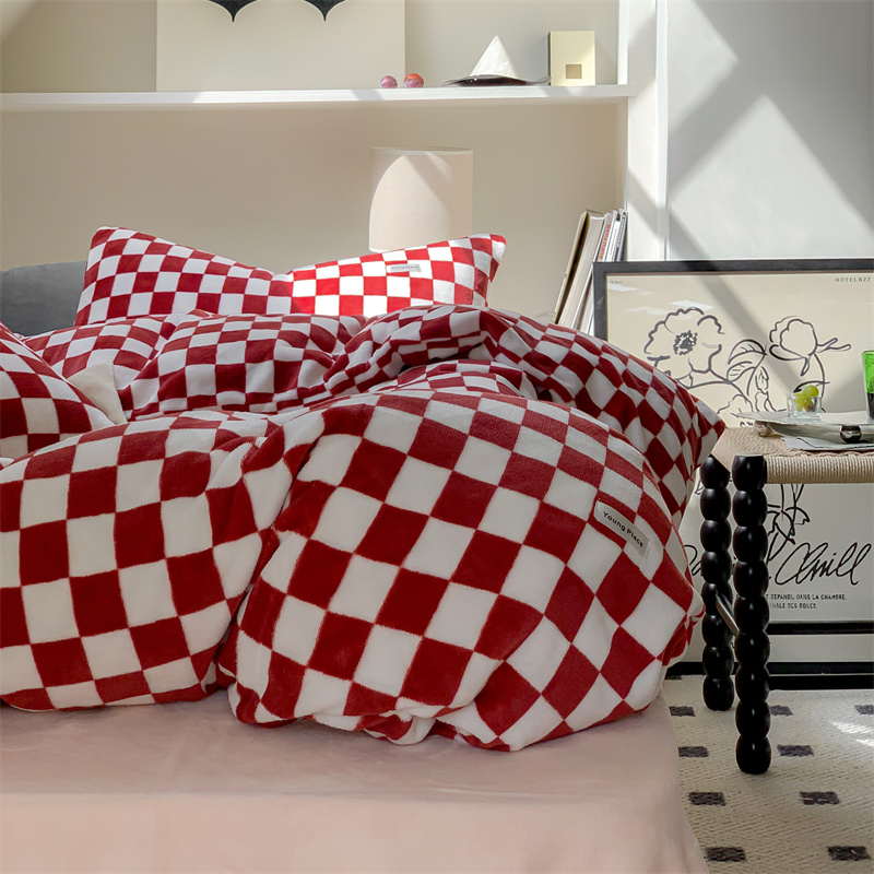 商品名称:洋铭区2022新款小清新撞色系列绒四件套 棋盘格红